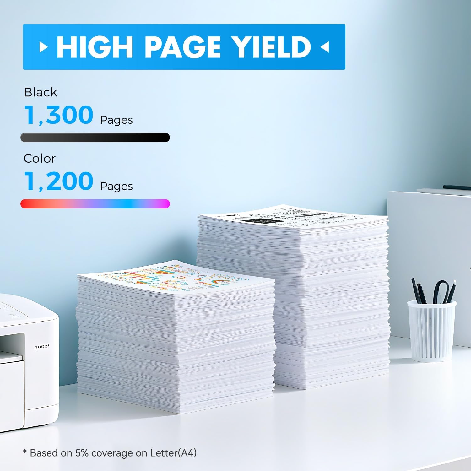 - 【Page Yield】Up to Black is 1,300 pages per black cartridge and Color is 1,200 Pages per color cartridge (Letter/A4, at 5% Coverage).