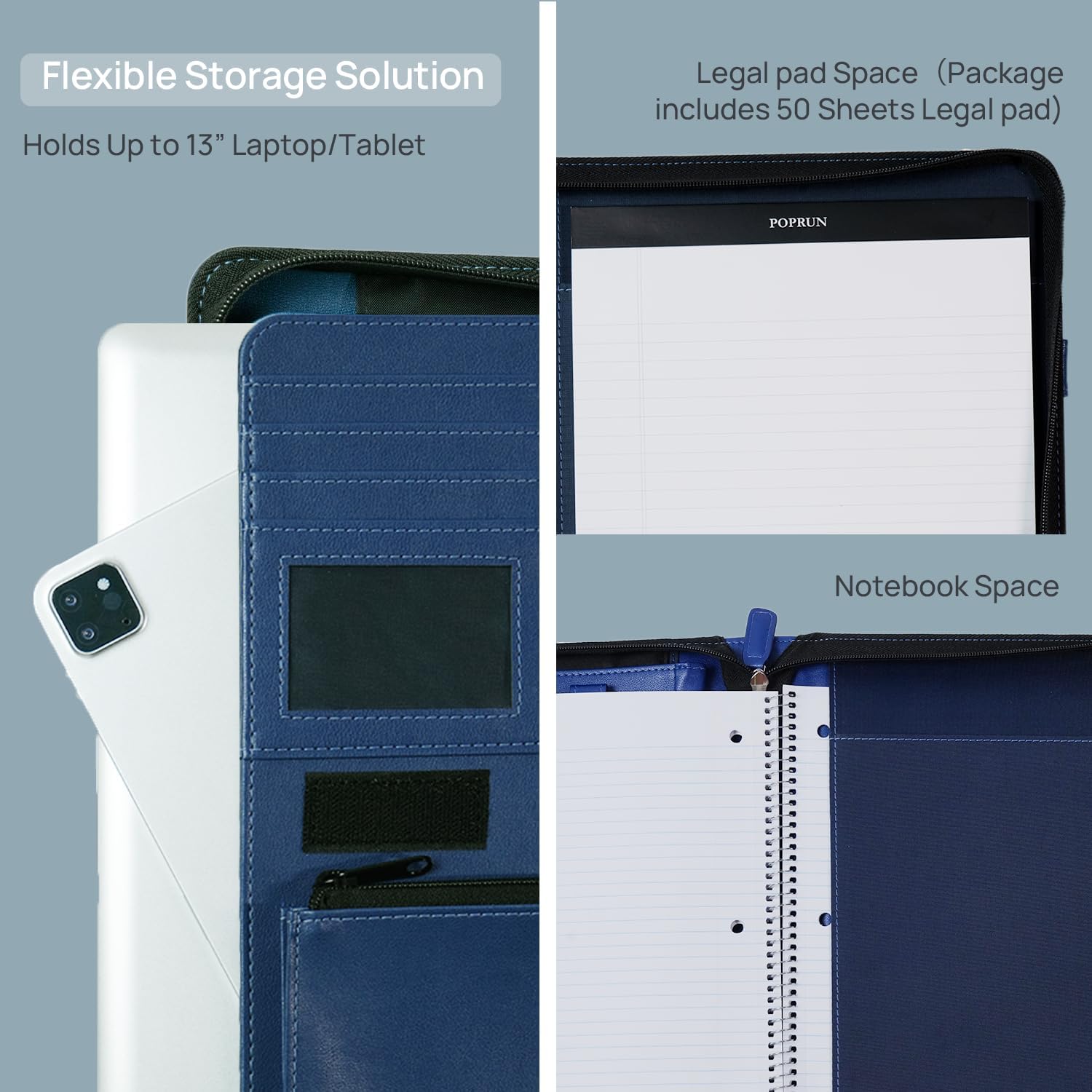 POPRUN Portfolio Binder with Zipper, Leather Padfolio Document Organizer with Storage, Professional Business Briefcase Ideal for Meeting Presentation Work-Includes 50 Sheet Writing Pad, Blue