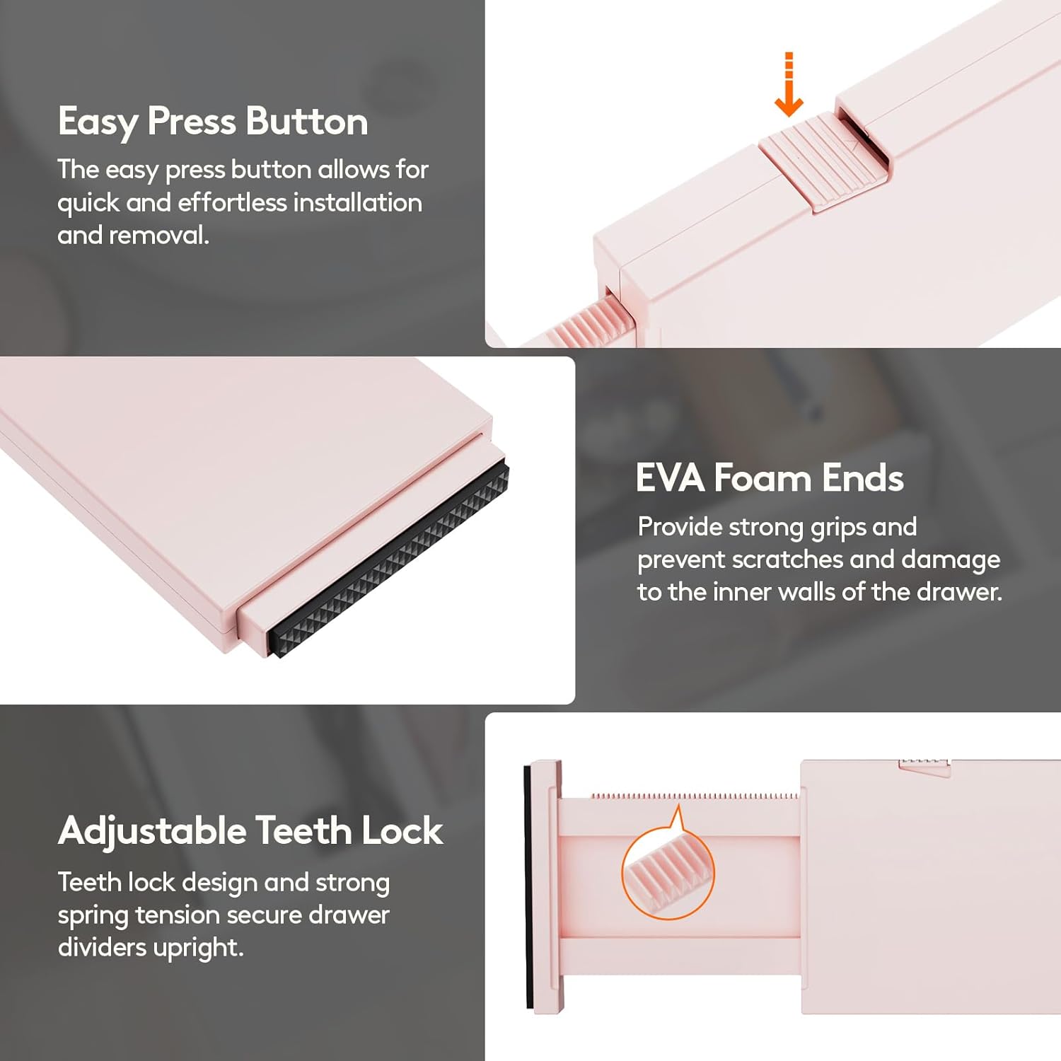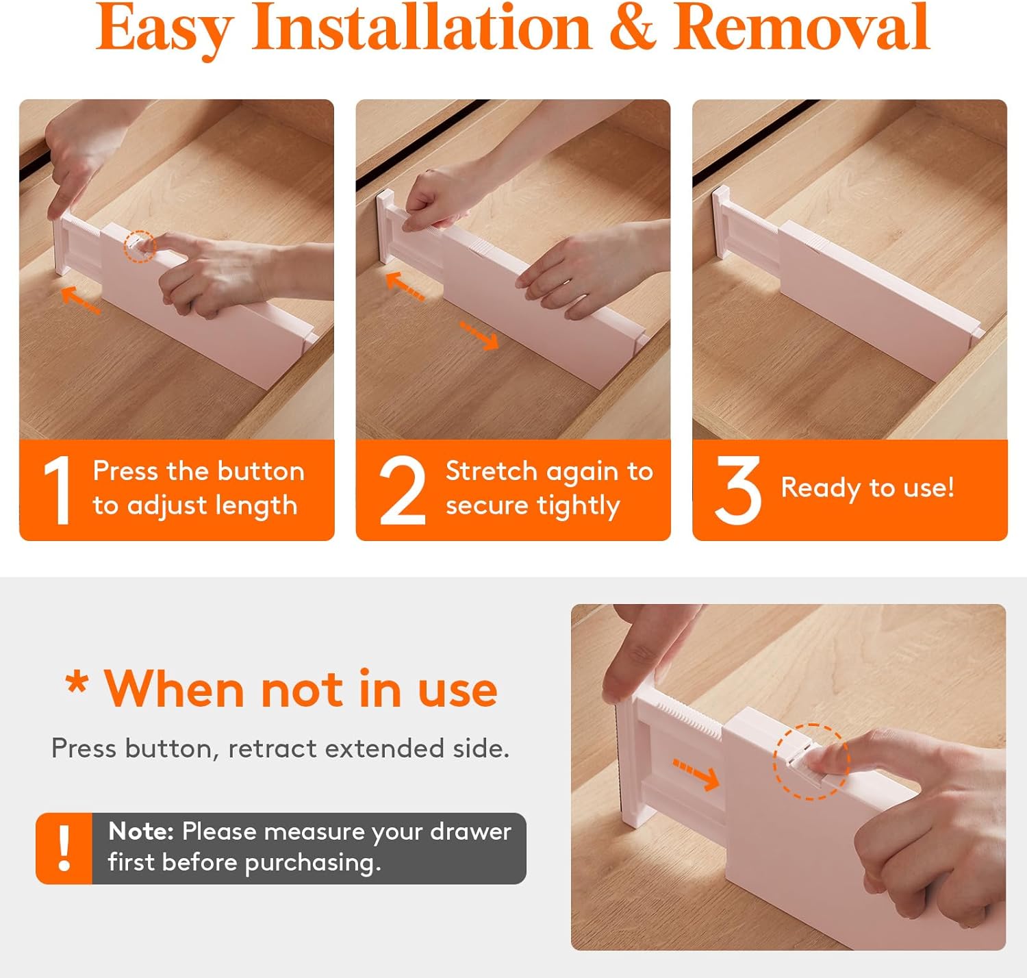 - Easy Installation & Removal: Press the top button to adjust the length before placing, and stretch it out again to secure it tightly before locking it. The strong spring tension keeps each drawer organizer securely upright. To retract, press the top button and push the stretched side