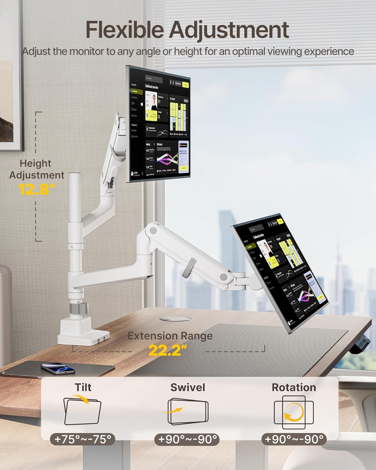 - 【Ergonomic Comfort Meets Ultimate Flexibility】 Engineered for a superior viewing experience, this dual monitor arm offers an extended vertical height range up to 29.4", with a 19.2" pole that helps to reduce neck strain and improve sitting posture during long hours of work or play. The full motion design allows -75° to +75° tilt, ±90° swivel, and ±90° screen rotation, giving you complete control to eliminate glare and find the most comfortable angle for any task. Whether you're stacking two ultra-wide monitors for immersive gaming, coding with split-screen efficiency, or reviewing large data sets side by side, this arm adapts to your workflow seamlessly