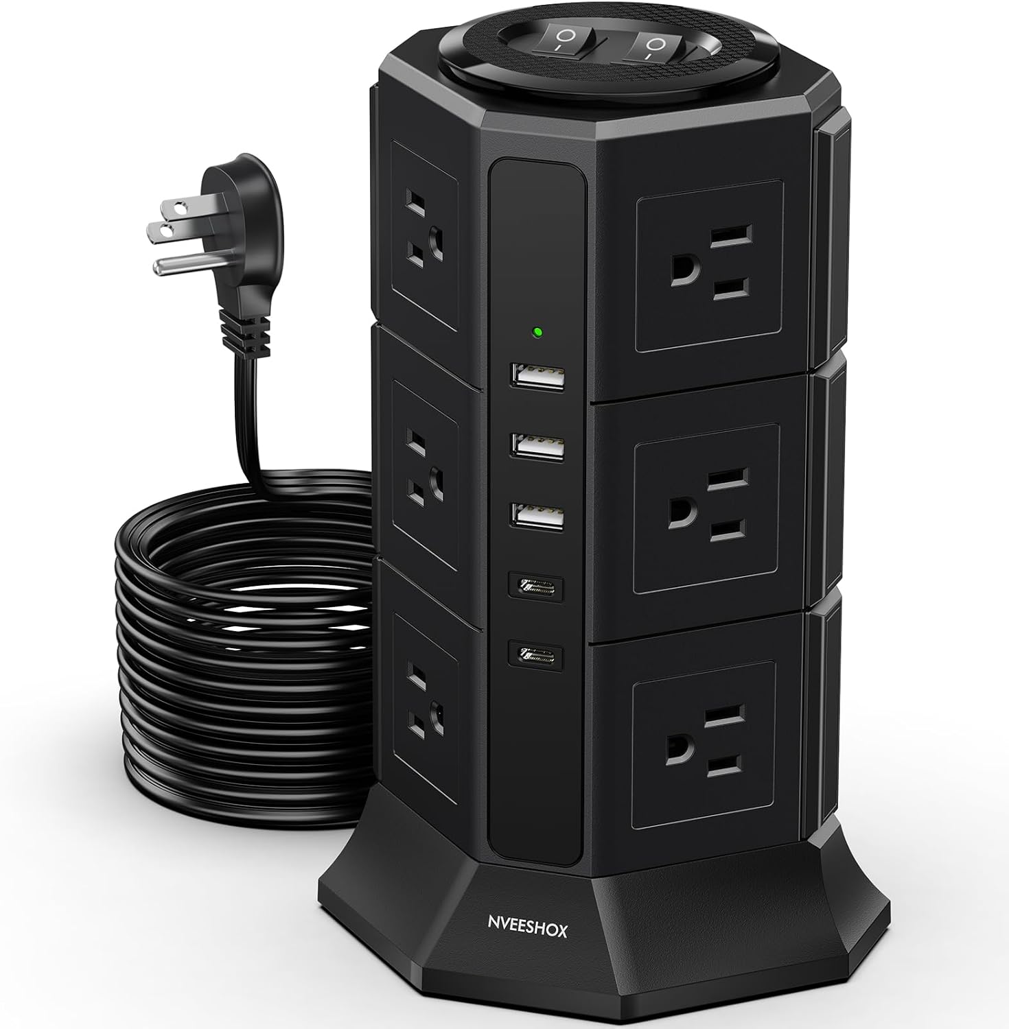 - 17 IN 1 SURGE PROTECTOR OUTLET EXTENDER TOWER : This surge protector power strip tower extends one socket to multiple outlets – 12 AC outlets and 5 smart USB ports (3 USB-A and 2 USB-C) . With an extra wide 2.95 IN space between the AC ports, it can accommodate almost all sizes of plugs, and can power multiple devices at the same time without blocking other power ports. Turn a single outlet into a multi-port charging station for your home, office or dorm room!