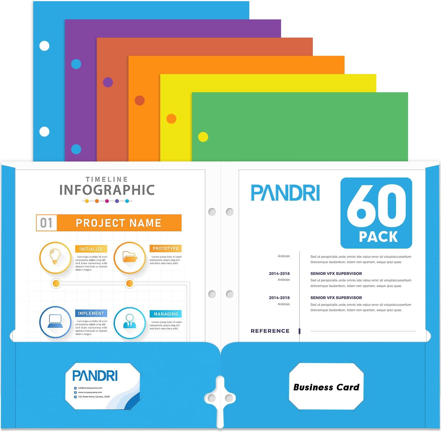 Two Pocket Portfolio Folders, PANDRI 60 Pack 3 Hole Punched 2 Pocket Folders for 3-Ring Binder, Letter Size Paper File Folder for School Office Home Business, Assorted 6 Colors