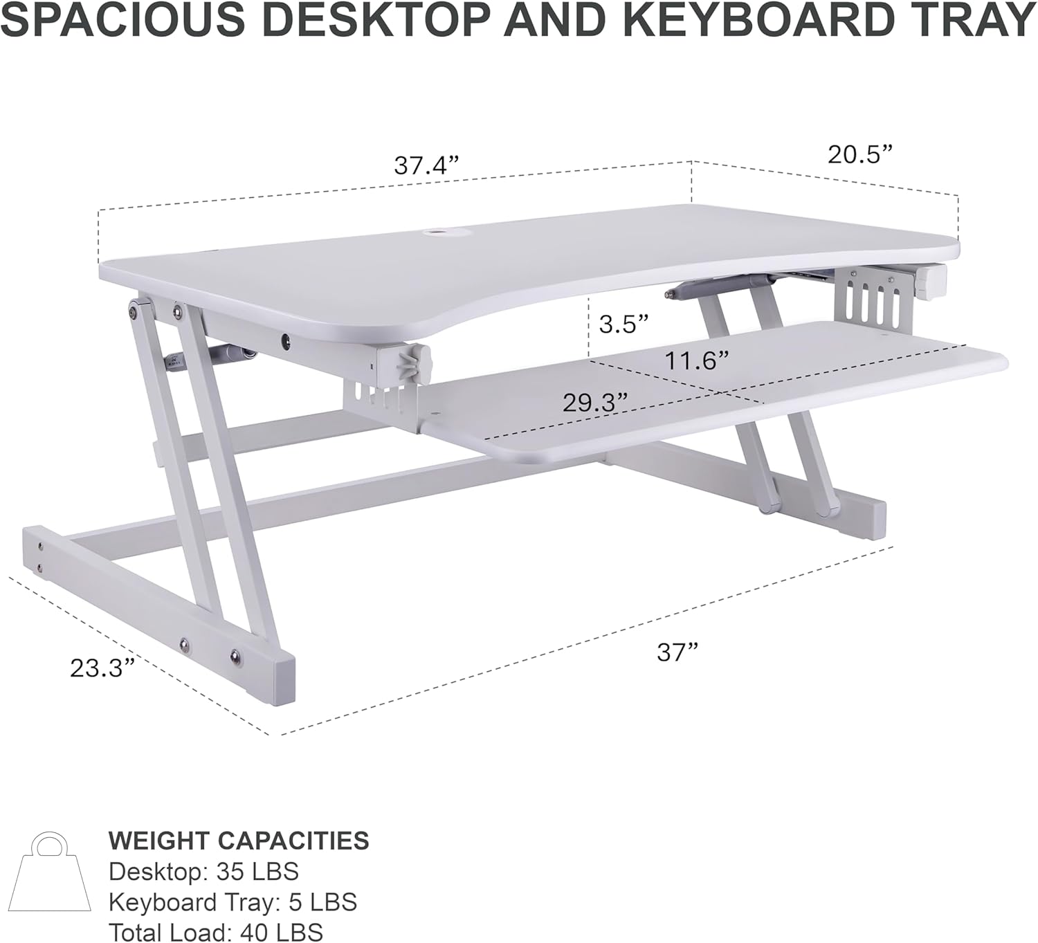 - Large stand up desk converter - 37.5" wide by 20.5" deep desktop workstation riser holds up to two 32" monitors plus other work materials and the 29.3" by 11.6" retractable tray will hold a keyboard and mouse, or even a laptop if needed.