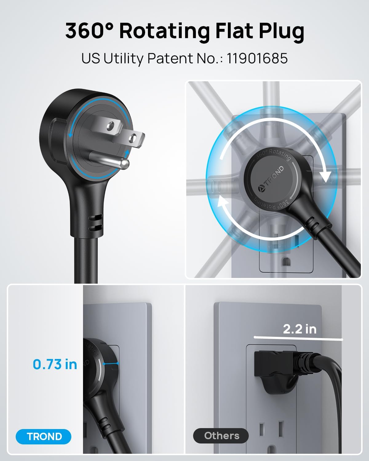 - 360° Rotating Flat Plug 10ft Extension Cord: This power strip features a 0.73-inch-thick swivel plug. Its unique 360° rotating design allows the plug to adjust to any angle, offering enhanced flexibility in tight spaces. The heavy-duty 10ft extension cord supports a higher current capacity (15A). US Utility Patent No.: 11901685