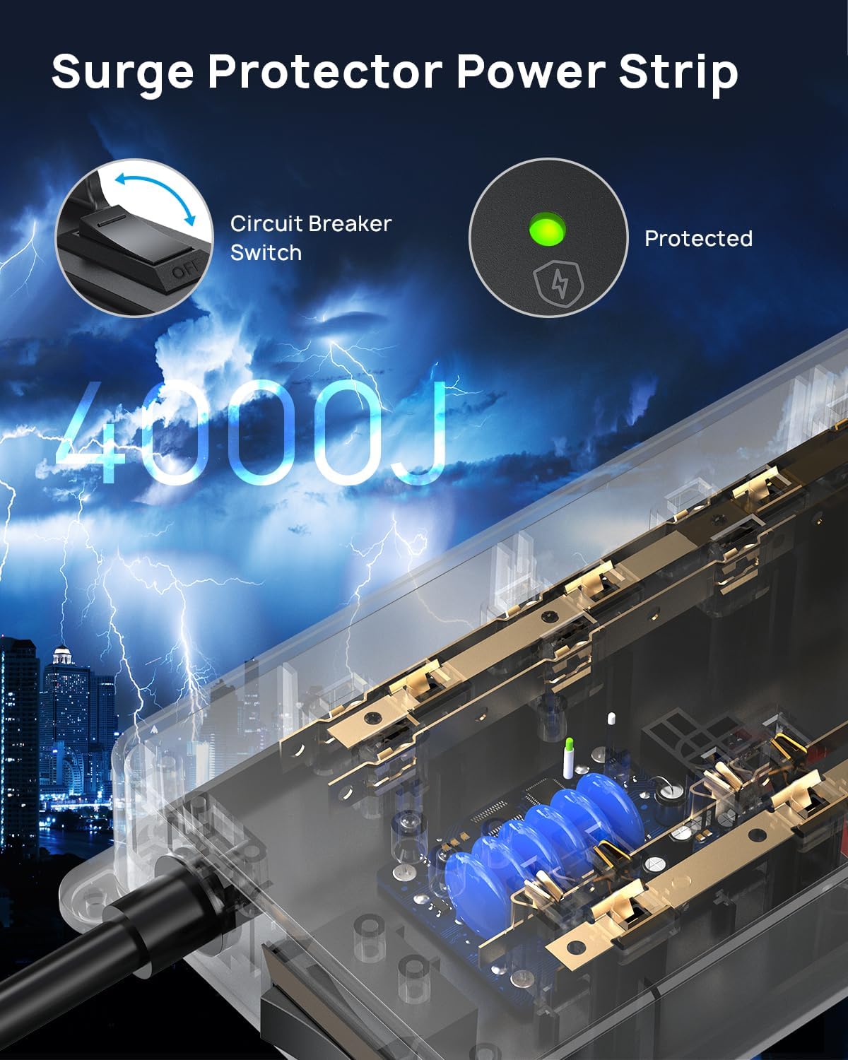 - 4000 Joules Surge Protection: This ETL-listed power strip is made from high-quality UL94 V-0 flame-retardant material. With a high surge protection rating, it helps safeguard your electronics from power spikes, surges, and lightning strikes