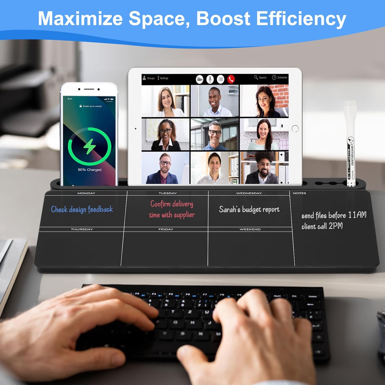 - Multiple Functions - To enhance the overall convenience of the product, this whiteboard includes 1 large pen holder, 2 small pen holders and 1 slot on the top which can hold 3 markers, a tablet and a phone. Equipped with charging port notch in the slot, the desk board is a good option to realize office charging, and you can charge your phone quickly. This dry erase board is more ergonomic with the perfect ramp design and non-slip design, which can make itself be used as keyboard pad.