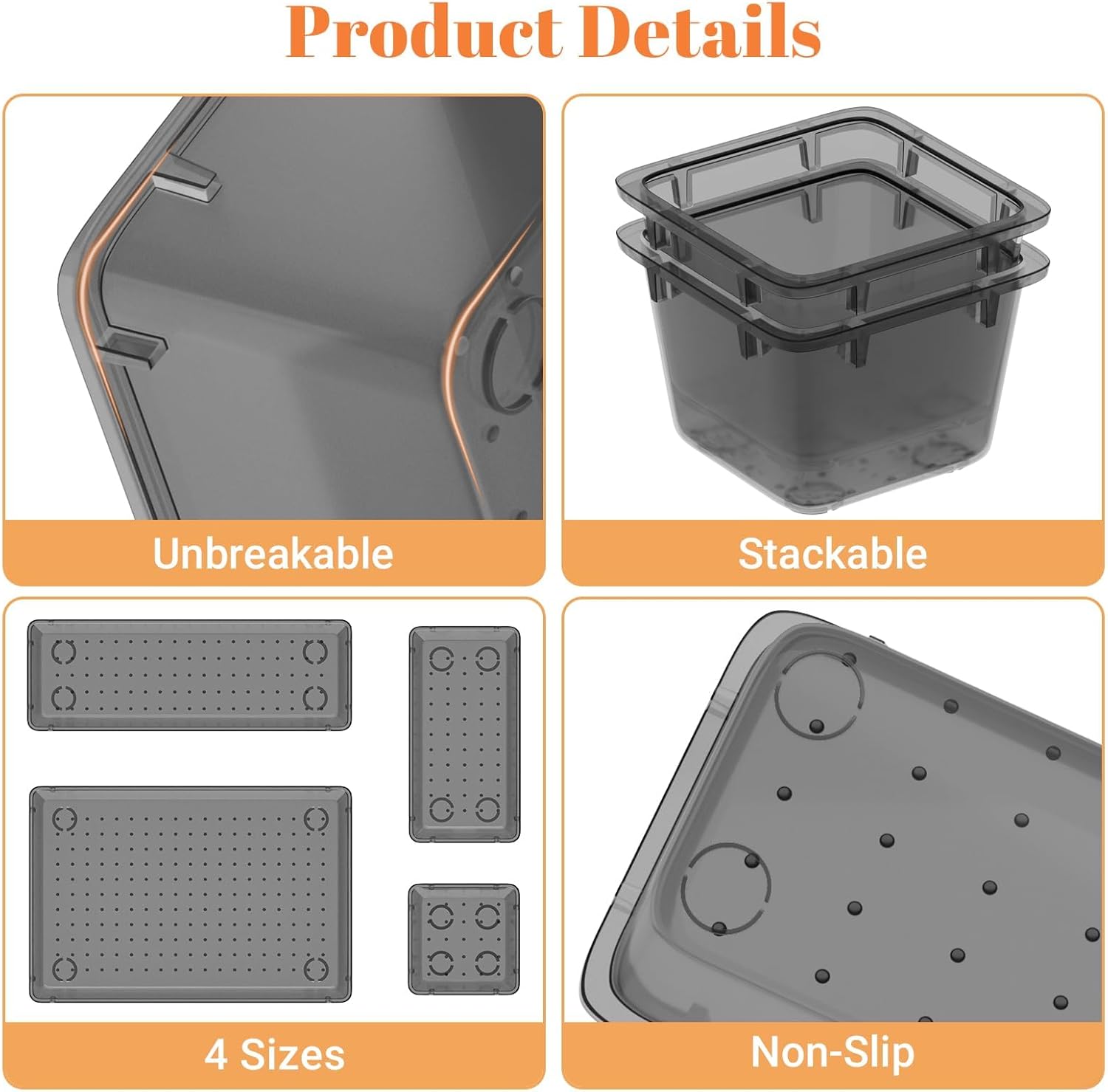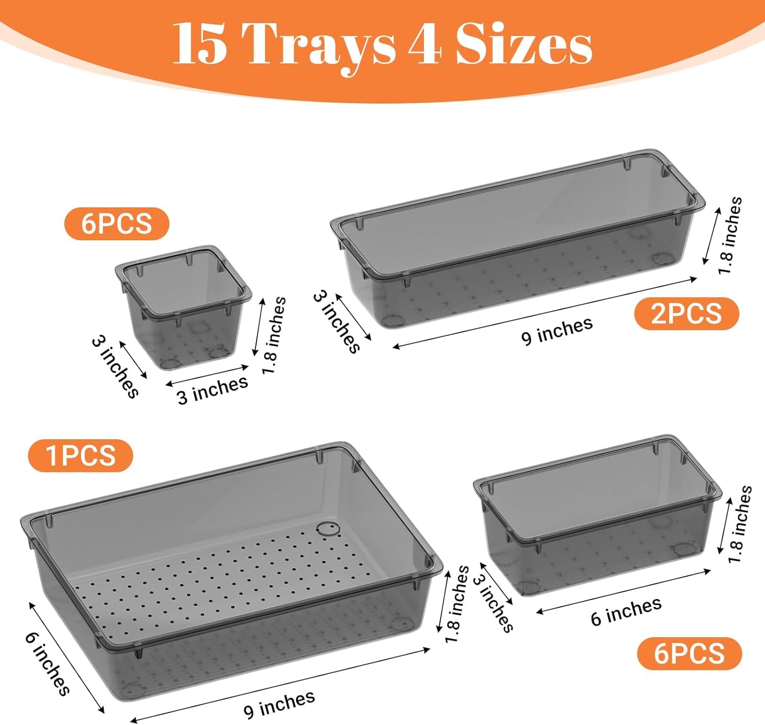 15 PCS Clear Plastic Drawer Organizer Set, 4-Size Acrylic Drawer Storage Trays, Storage Bins for Makeup, Gadgets, and Jewelry in Bathroom, Bedroom and Office, Clear Black