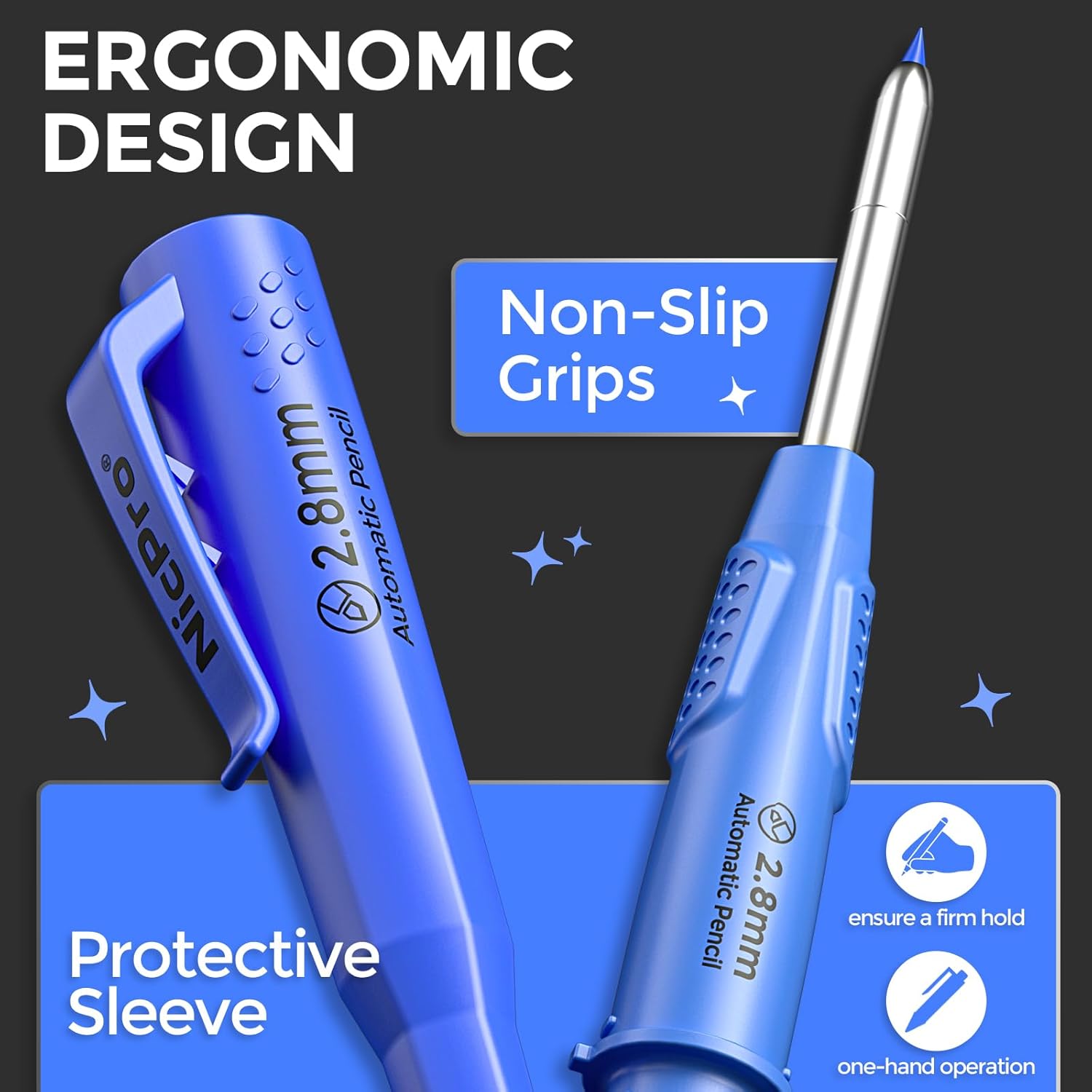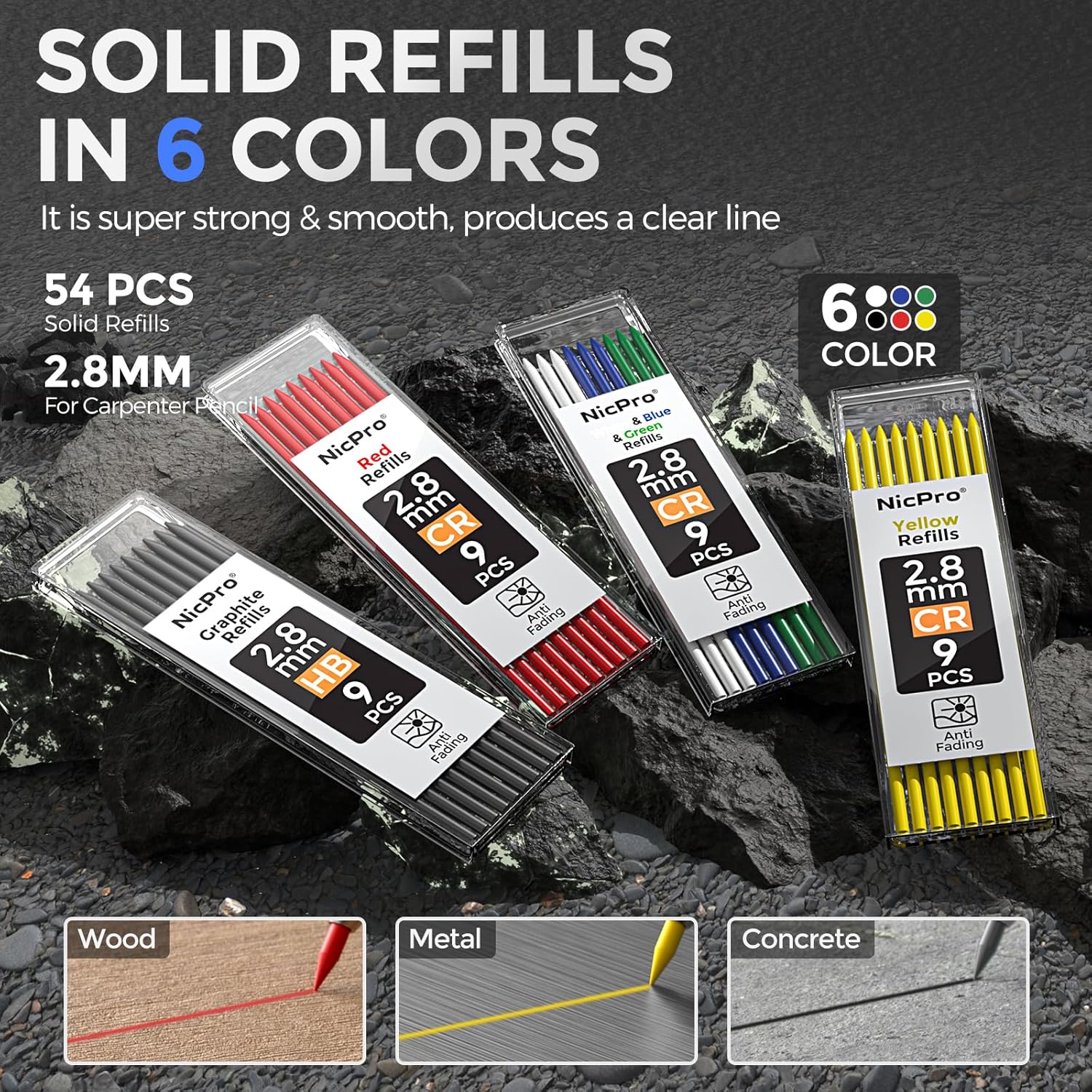Nicpro 5 Pack CP3000 Carpenter Pencil with Sharpener, Mechanical Pencils Set with 59 Refills, Heavy Duty Construction Pencil, Carpenter Tools for Architect Marking (Red, Black, Orange, Green, Blue)