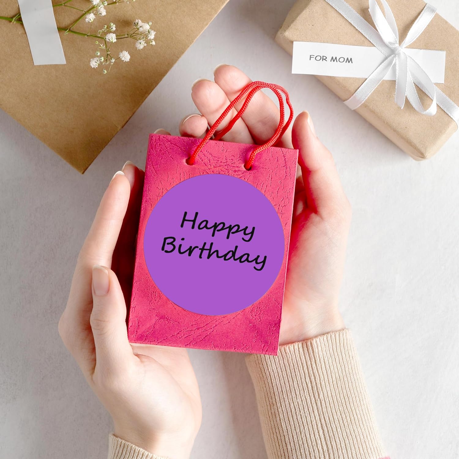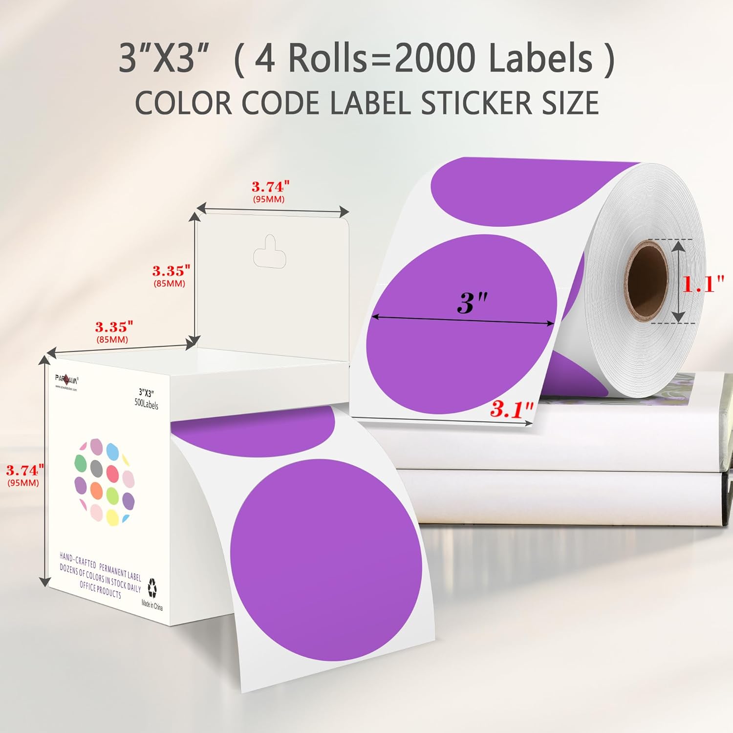 - The package includes 4 rolls 2000PCS 3x3 Inch round diameter purple color-code dots stickers, each roll sticker label in a individual plastic dispenser case and 4 rolls in a larger box.