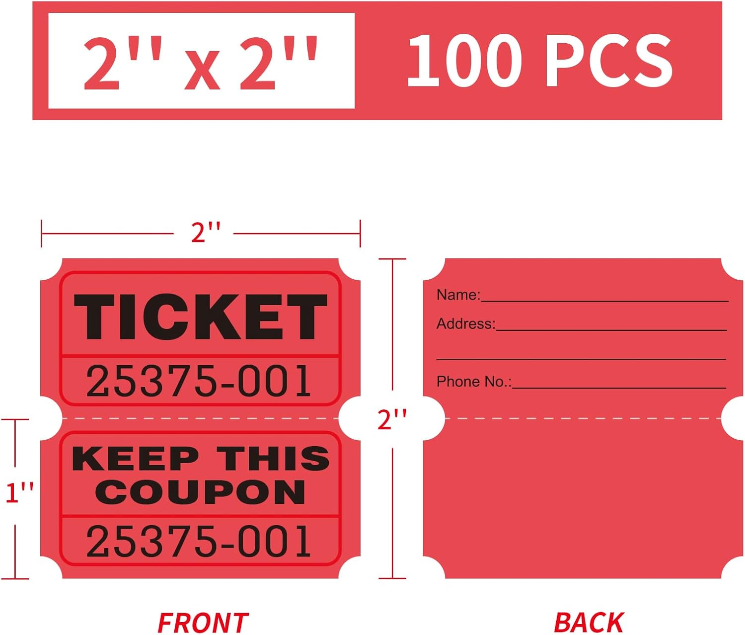 - Each pack contains 100 2-part tickets, flat packed for easy storage and organization. Each double stub raffle ticket measures 2x2 inches and can be divided into 2 X 1 inch halves.