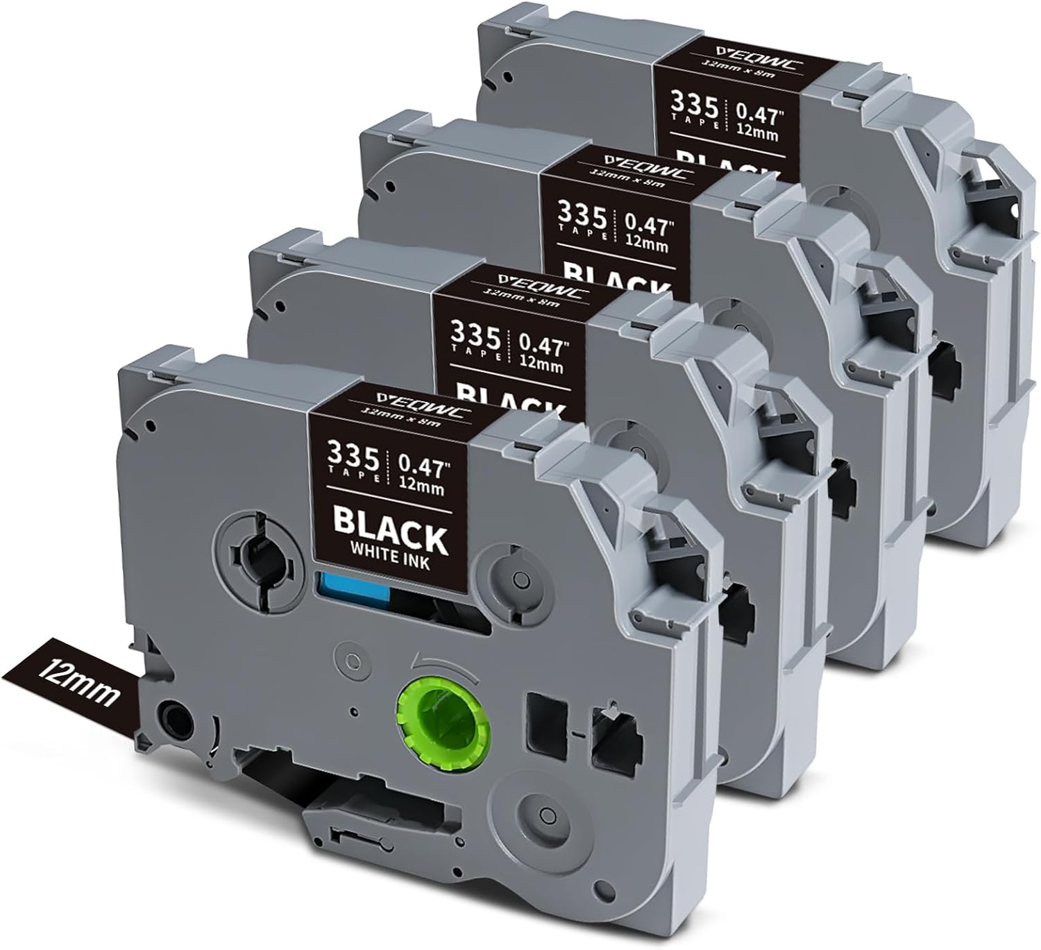 Tze335 Tze 12mm 0.47 Laminated Black Label Maker Tape Compatible for Brother Tze-335 Tz-335 Tz 1/2 Refill Work for Ptouch PT-D210 PT-D220 PT-H110 PT-D400 PT-D600, White on Black, 4 Pack