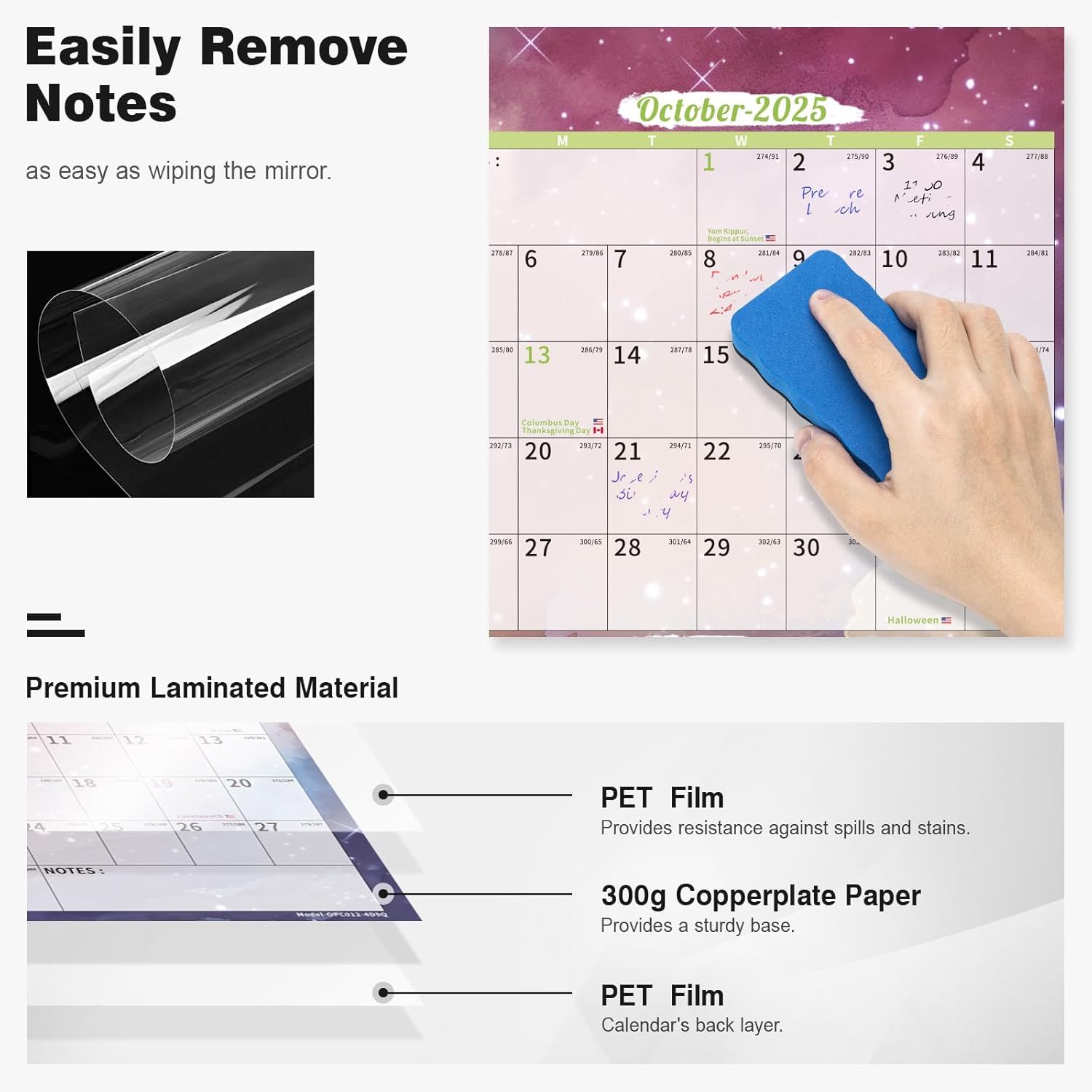 - ✨ Dry Erase Wall Calendar : is made of PET Film and 300 grams Copperplate Paper, providing a durable surface that resists scratches and smudges, while the sturdy Copperplate Paper backing keeps it in place without curling.