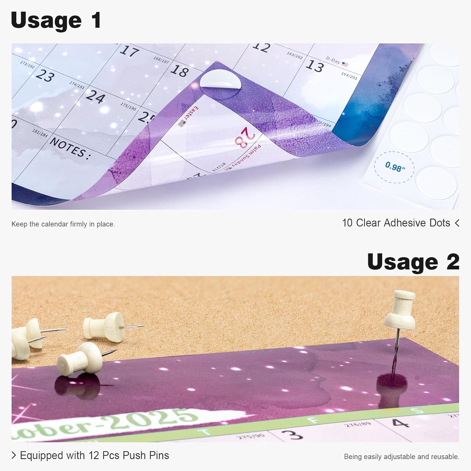 - ✨ Laminated Calendar with Dates: Waterproof wall calendar comes with a mini eraser, four dry-erase markers, 12 push pins, and 10 transparent round stickers. 12 months calendar covers the time range from July 2025 to June 2027, making it perfect for long-term use.