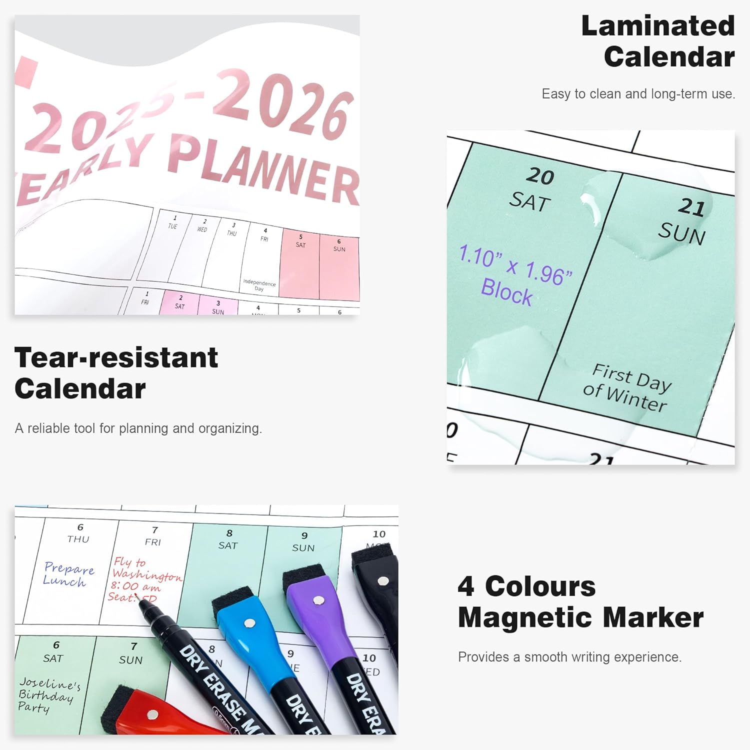 - ✨ Laminated Calendar with Dates: Waterproof wall calendar comes with a mini eraser, four dry-erase markers, 12 push pins, and 10 transparent round stickers. 12 months calendar covers the time range from July 2025 to June 2026, making it perfect for long-term use.