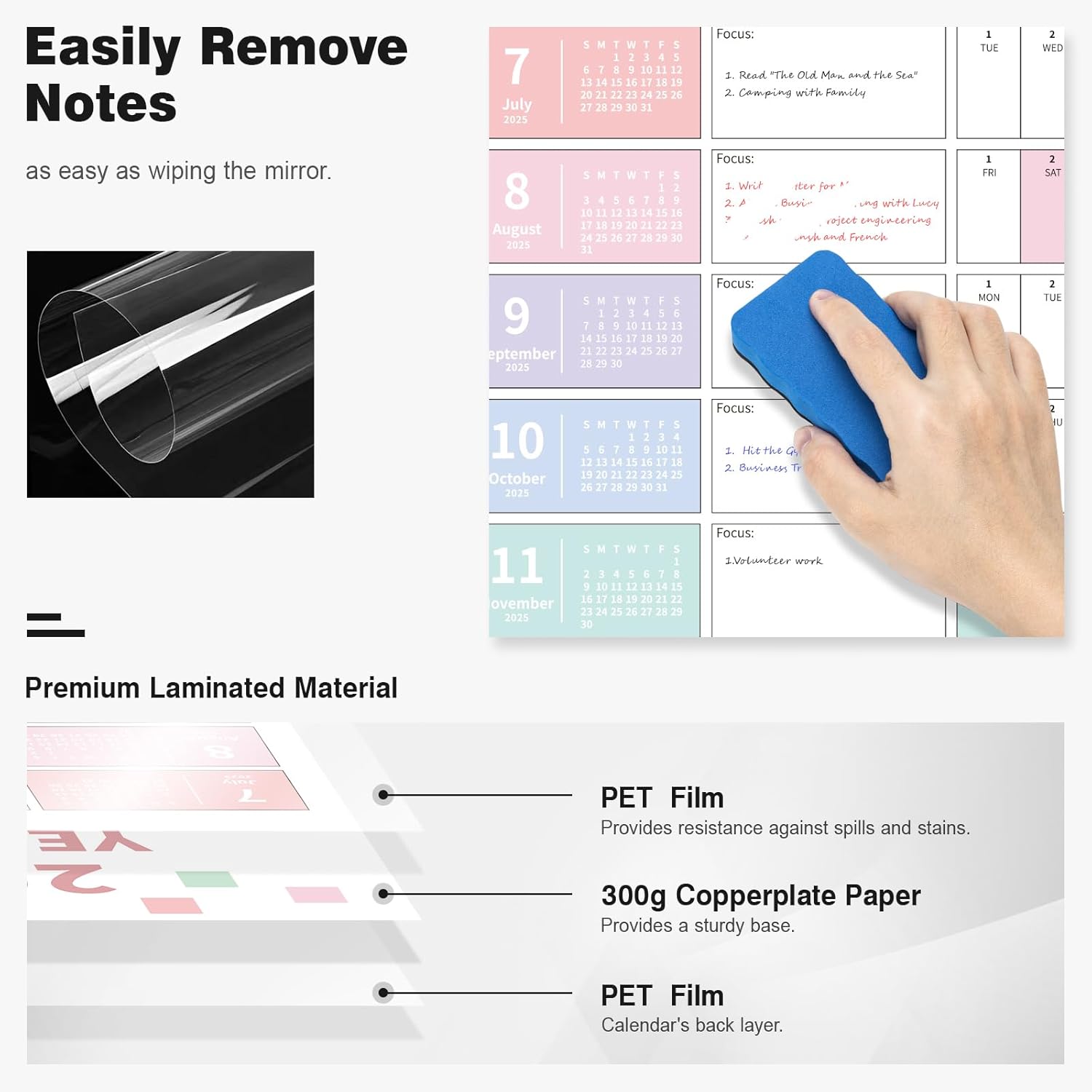 - ✨ Dry Erase Wall Calendar : is made of PET Film and 300 grams Copperplate Paper, providing a durable surface that resists scratches and smudges, while the sturdy Copperplate Paper backing keeps it in place without curling.
