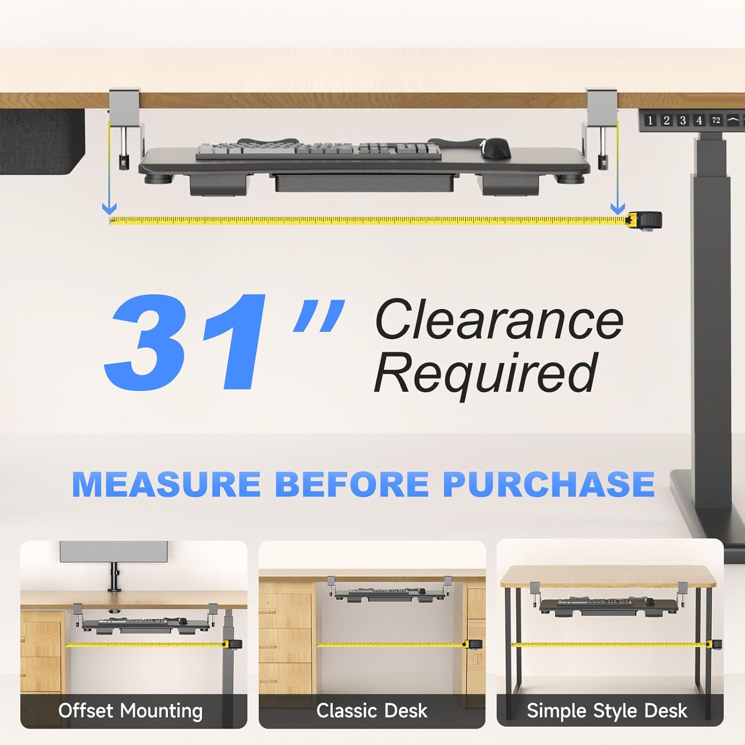 - Smooth Slide Mechanism: Effortlessly pull the tray out (extends 7.6”) or tuck it under the desk (sits 11.5” from the edge). Requires at least 11.4” of under-desk clearance for smooth operation.