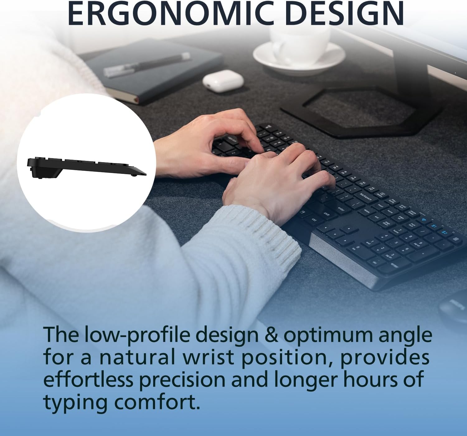 - 【Upgraded Wireless & Bluetooth】-The included 2.4GHz USB-receiver for stable wireless connection up to 42 feet (12m) - plug & play, no pairing or software required.Bluetooth 3.0/5.0 compatibility seamlessly connects smartphones/tablets, eliminating cable clutter.One-touch switching between devices enables effortless multitasking for office work.