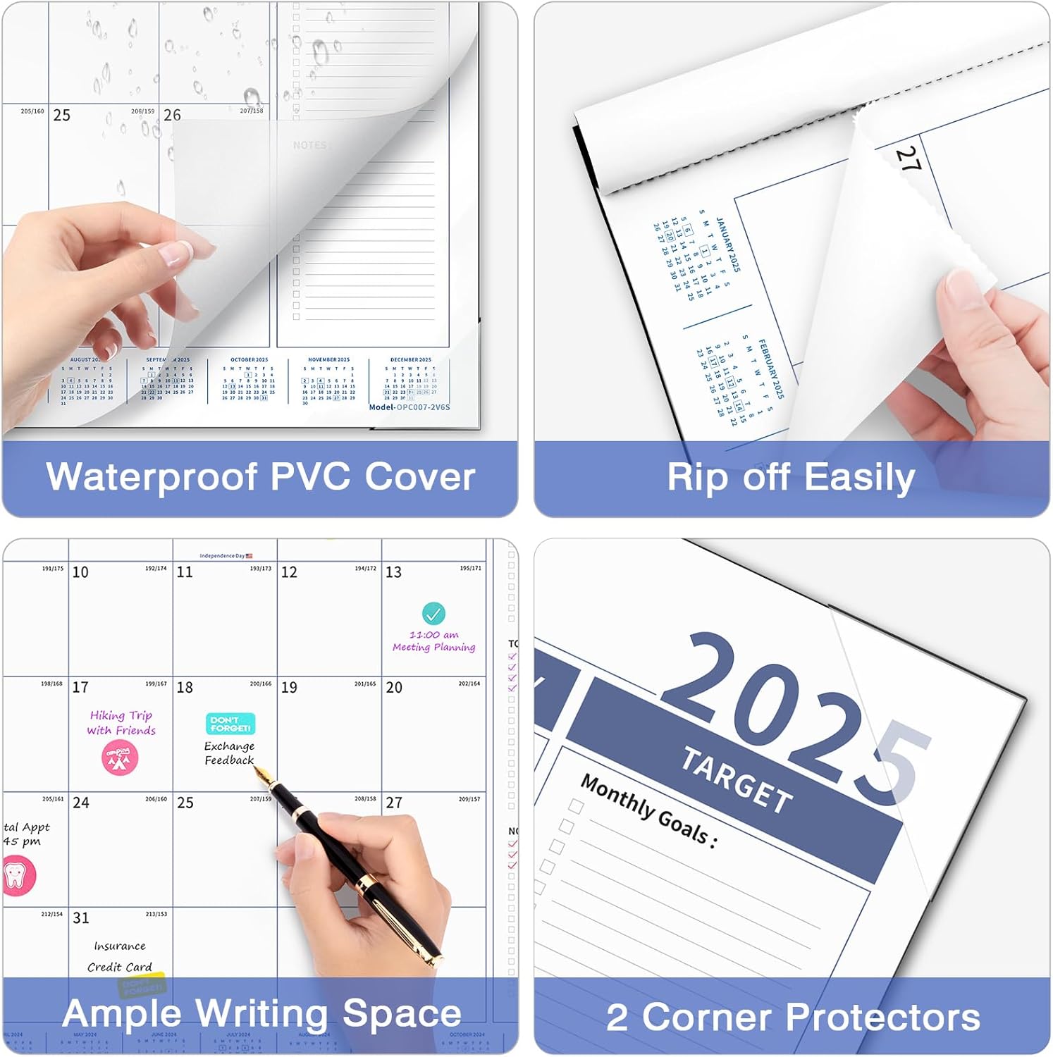 - 【Premium Thick Paper】With a weight of 0.264lb per sheet, the 2025 calendar is designed using premium thick paper, ensuring a high-quality writing experience. It is resistant to ink seepage, resulting in clean and crisp writing. To safeguard the calendar from dust and liquids, it comes with a transparent PVC cover. Two corner protectors are included to keep the pages flat. Plus, the cutting line allows for effortless tearing of each month's page. This desk calendar is perfect to long-term use.