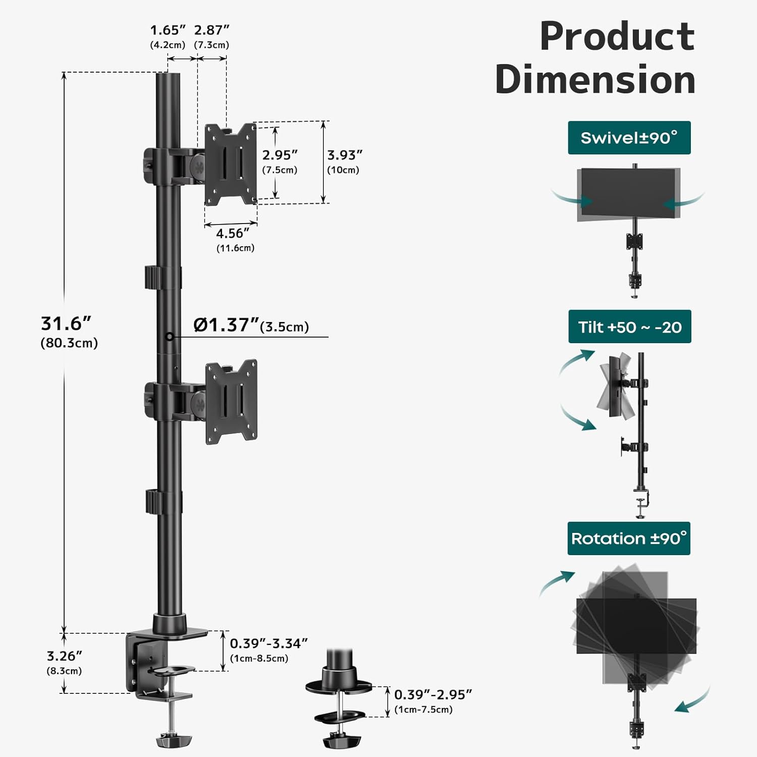 - Space Saving Vertical Design: Place two monitors on the 803mm high center pole to save space and maximize your productivity. Perfect for those using ultrawide monitors in compact areas, Excellent solution for desks against walls or in small spaces like offices, homes, studios, and apartments.