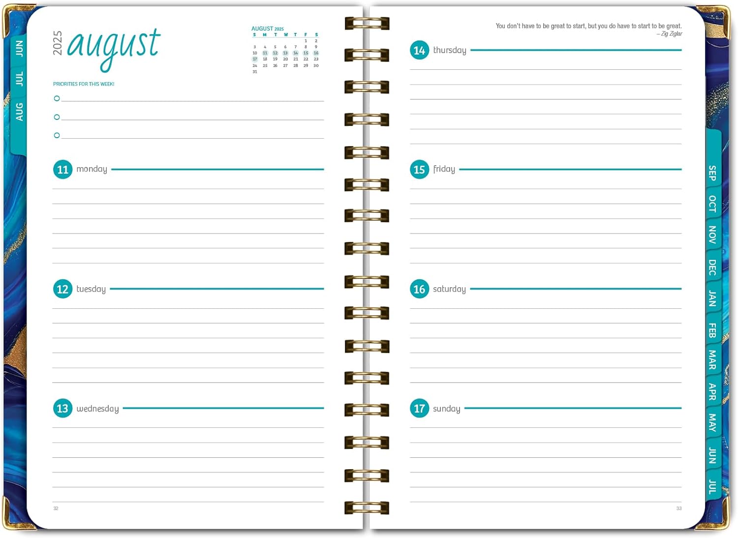 - 2 Page Monthly Spreads followed by 2 Page Weekly Spreads