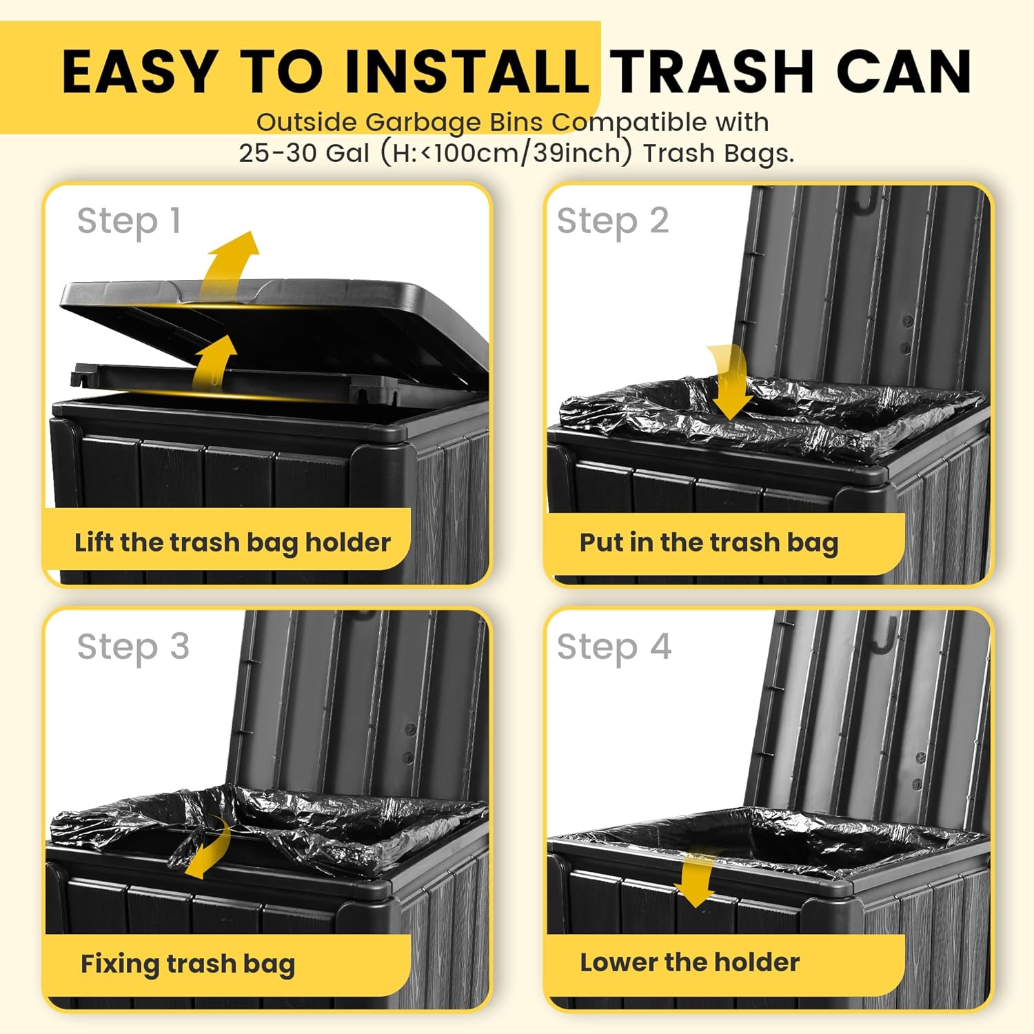 - Quick Install - This outdoor trash bin comes with a detailed user manual. No screws or tools required, just snap the panels together and the installation can be completed in about 10 minutes.