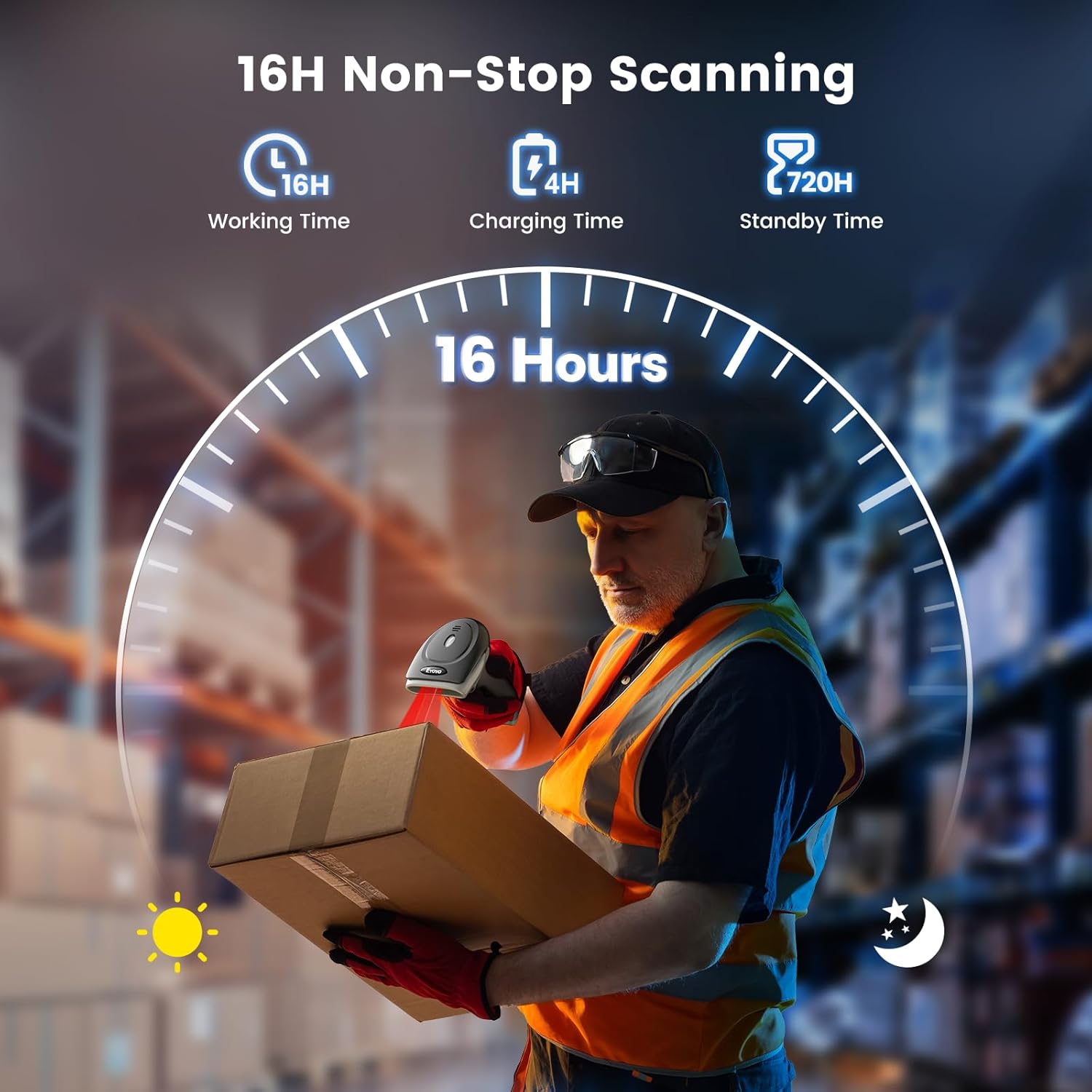 - 2500mAh for Longer Scanning Experience: The Eyoyo QR Code Scanner with the long-lasting 2500mAh battery supports over 57,6000 scans in a single charge, that’s more than 16 hours of continuous scanning just 4 hours of charging. Guaranteed full shift battery power, your worker no need to waste time recharging during the business day