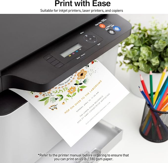 - 【Printer Friendly】This sturdy and versatile white cardstock is suitable for most laser and inkjet printers, computers, as well as photocopy machines. Printable and thick, it ensures excellent print quality. Before printing or making a copy, please check your printer's maximum size and thickness specifications to ensure compatibility with the cardstock.