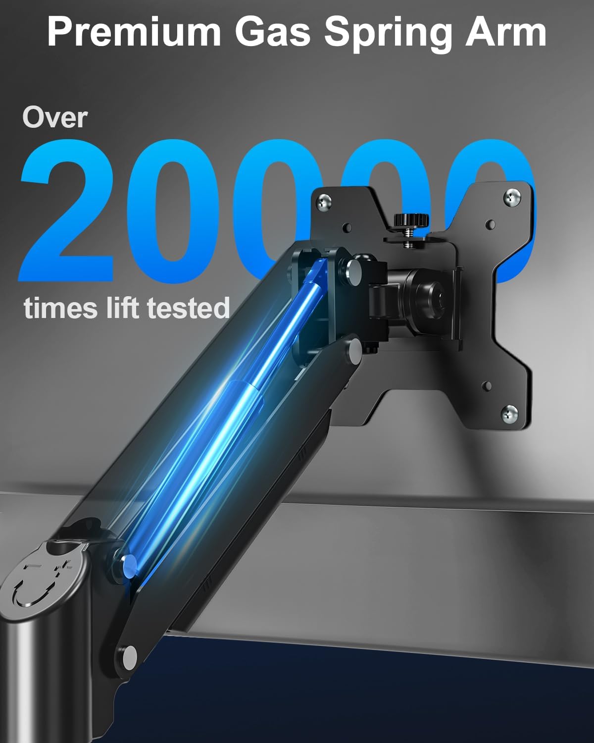 - Ergonomic Design - Features Features +70°/-45° tilt, ±90° swivel and 360° rotation, enabling seamless transitions between portrait and landscape modes to reduce neck strain. Equipped with a high-quality gas spring mechanism, which has undergone rigorous 2,000+ cycle testing to ensure smooth and reliable movement, this mount is ideally suited for multitasking professionals and gamers