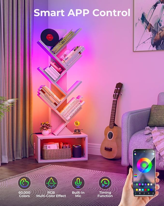 - 【RGBIC LED Lights】This corner shelf with light strips offering up to 60,000 colors and various dynamic modes; Adjust brightness, colors, and patterns via remote control or APP to match any atmosphere; Perfect for living room, bedroom, and game room