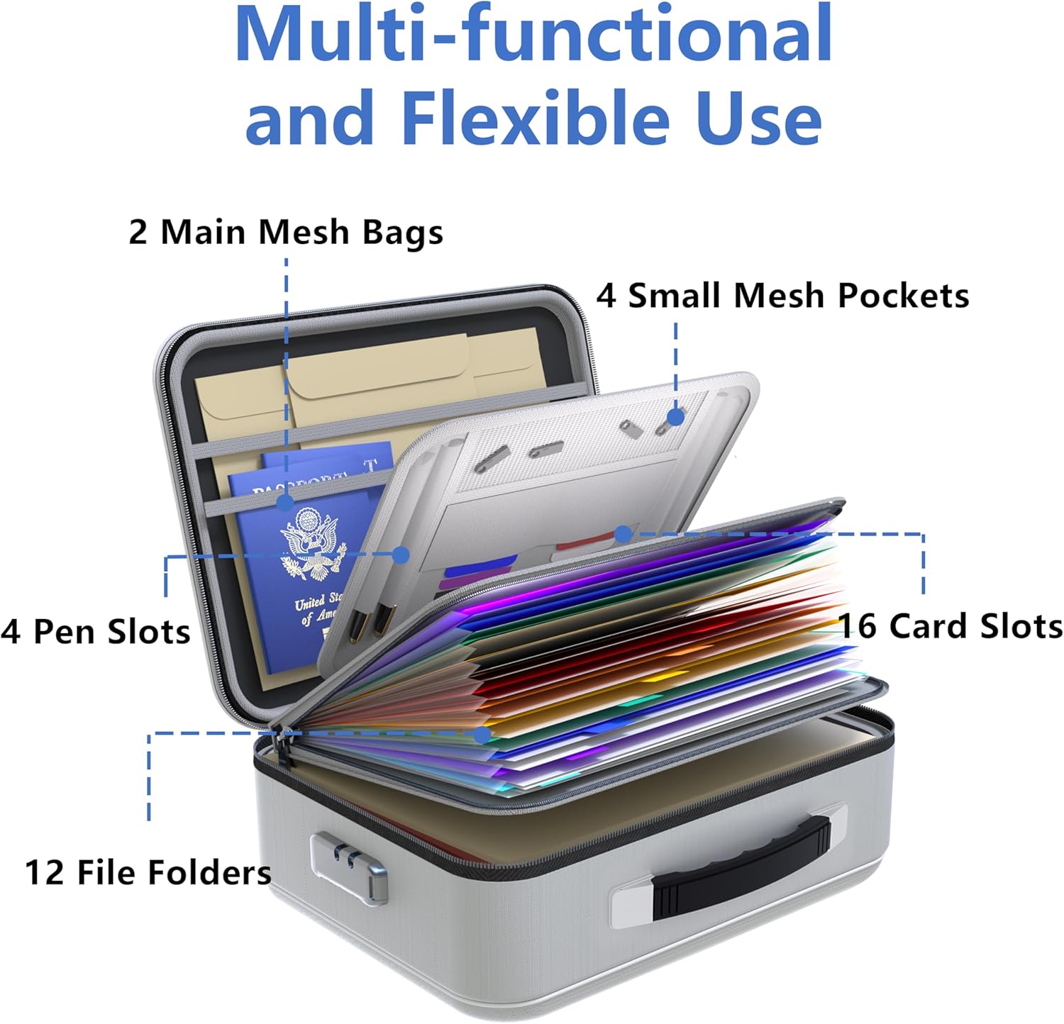 - Large Capacity with Smart Organization: Keep files neat and accessible. With 2 large mesh pockets, 4 small mesh pockets, 12 folders, 16 card slots, and 4 pen loops, this fire safe document box prevents clutter and is perfect for drawer or cabinet storage.