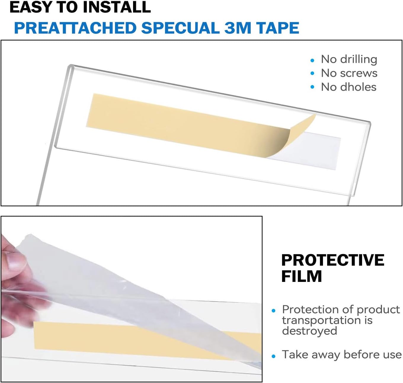 - 【Easy to Assemble】Our clear acrylic sign holder with powerful double-sided tape,it is easy to install on doors, wood, glass, walls, metal, plastic. No drilling,no screws,and no tools required.