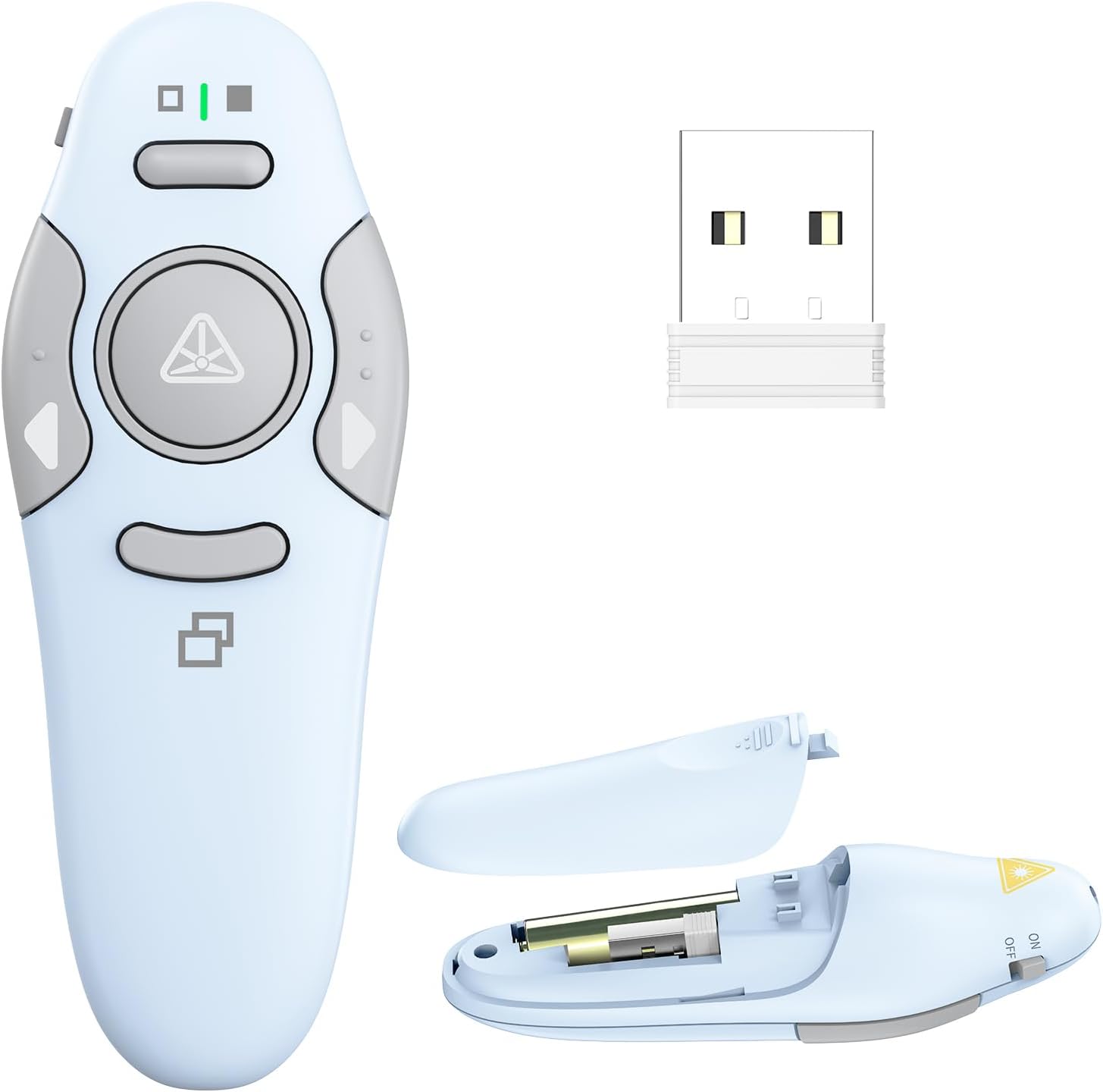 - Red Light Pointer for Clarity: Featuring a built-in red light pointer that stands out on most backgrounds, this presentation clicker helps you highlight key points in your presentation. The clicker for powerpoint presentations has standard buttons like page up/down, black/full screen switching, etc. With the light button held on, the remote works well reliably and effectively. The power switch to turn off after use helps extends battery life