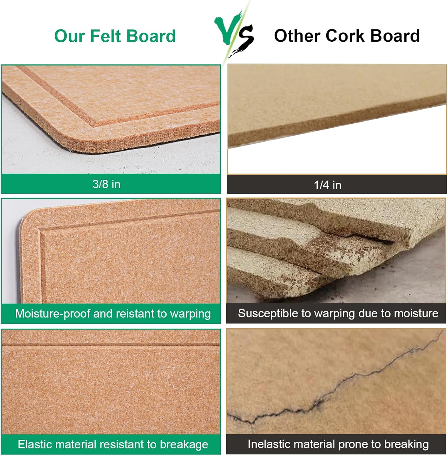 - Cork Board Alternative: Our felt board boasts smooth surface. The material is strong, easy to maintain, durable, and won't deform in humid air. No nails are required to install, and the included Velcro are removable and safe for your walls. A good choice for home offices, classrooms, and commercial places.