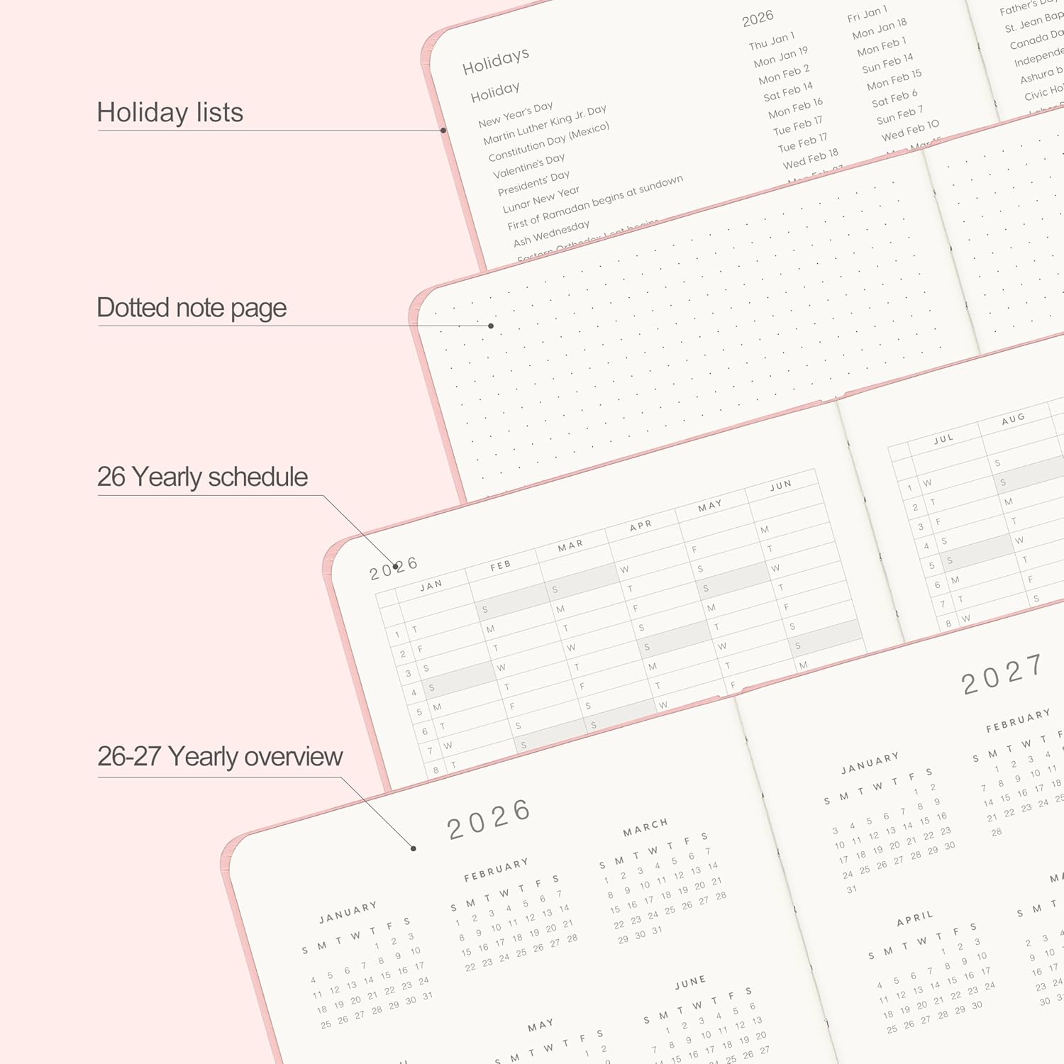 - MONTHLY OVERVIEW:Each date box provides enough writing space, including a display of holidays for each month, and the right notes row is additional planning space. 2 Ribbon bookmarks and month displays for easy navigation and lookup.