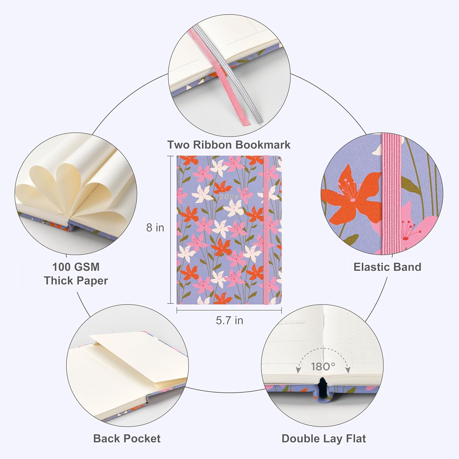 And Per Se 2026 Planner with Pattern-Daily, Weekly & 15-Monthly Leather Hardcover Planner, 5.7" x 8", Daily Schedule, Monthly Tabs, 100 GSM Thick Paper, Back Pocket(Blossom Purple)