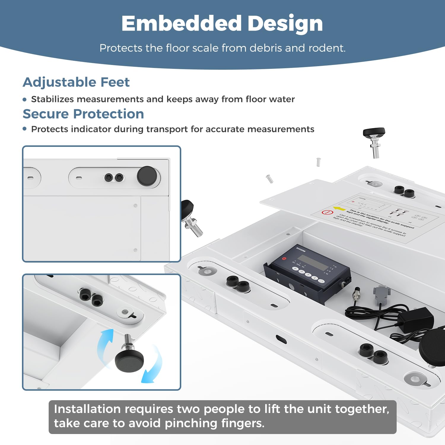 - Installation and Maintenance: The package includes a display charger, sensor cable, communication cable, four feet, and screws. Given its weight, we recommend that two people lift it to avoid damaging the product. Keep the scale remains level during use to protect the weighing components. We can assist you with the replacement and maintenance of weighing components. Additionally, the dashboard has a threaded lifting eye bolt hole, allowing for optional bracket attachment if needed.