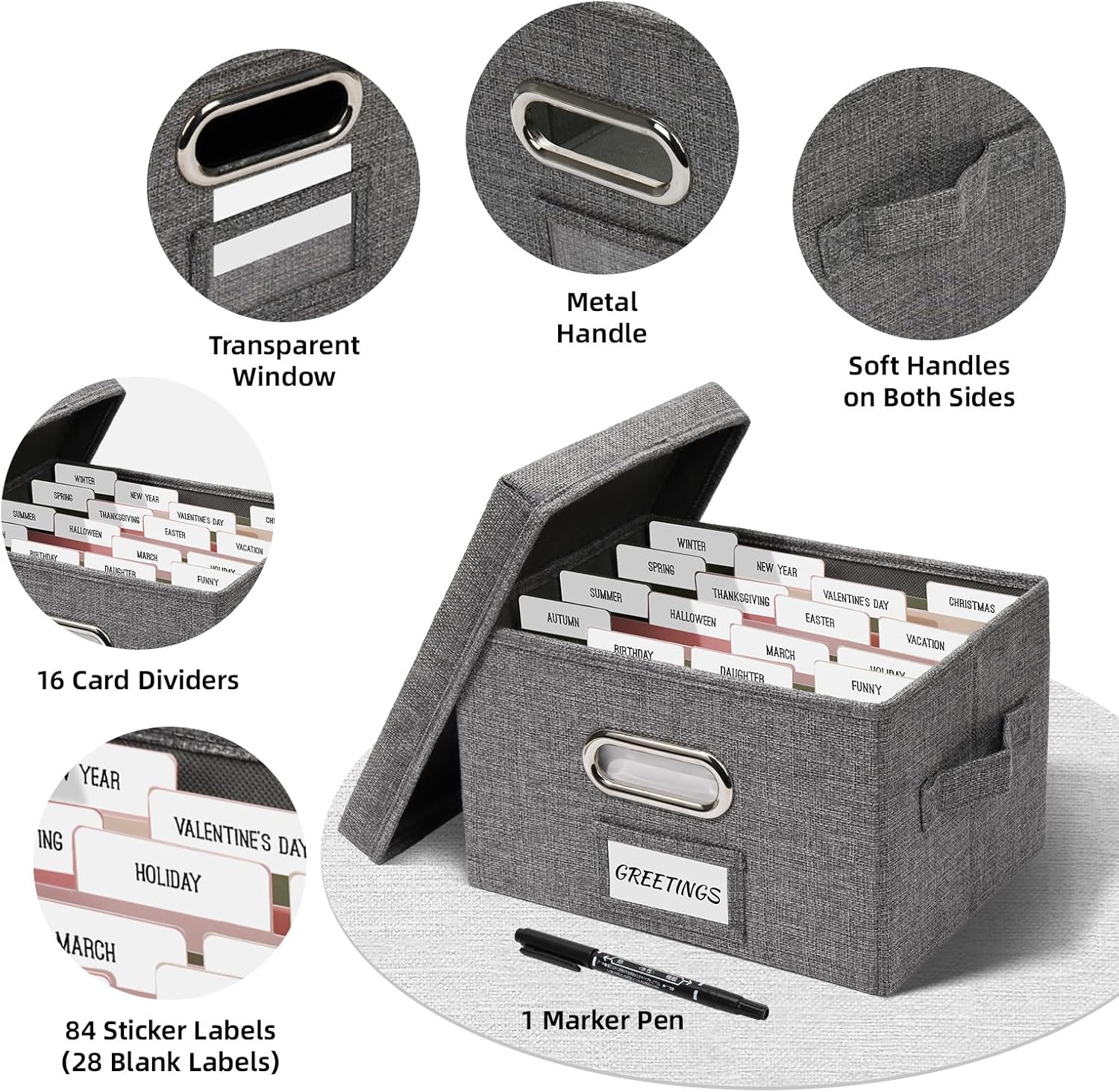 Greeting Card Storage Box, Linen Storage Box with 16 Adjustable Dividers, 84 Labels, 1 Marker Pen, Perfect for Organizing Greeting Cards, Envelopes, Photos 1 Pack Grey