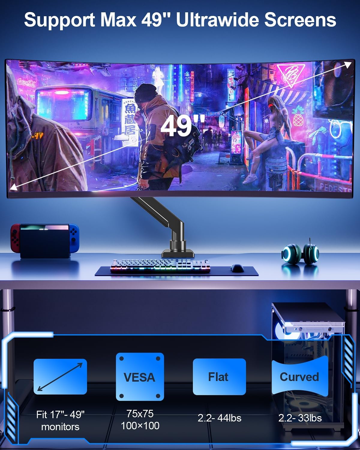 MOUNT PRO Heavy Duty Monitor Arm for Max 49 Inch Ultrawide Screens up to 44 lbs, Aluminum Premium Single Monitor Mount for Samsung Odyssey G9 and More, Adjustable Display Desk Stand, VESA 100x100mm
