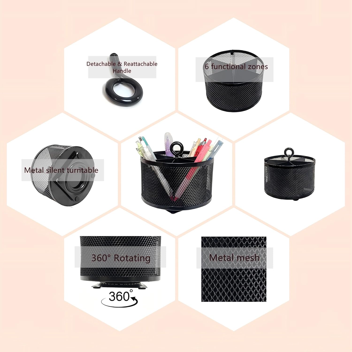 - 【Metal Mesh & 360° Rotating Base】Pen Organizer features durable black metal mesh construction for long-lasting use, paired with a smooth 360° rotating desk pen holder design. Quickly access pens, scissors, or art supplies from any angle without rearranging your workspace