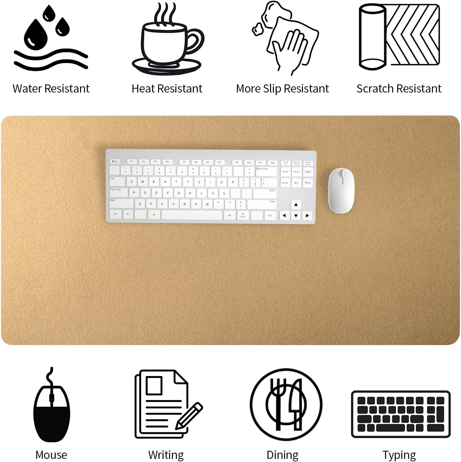 - 【Waterproof & Easy to Clean】The PU leather material desk mat is waterproof and heat resistant, easy to clean. It can perfectly protect your desktop from drinks, ink and other liquids. For cleaning, just wipe its surface stains with a damp cloth. Please note that its suede backing is not waterproof!