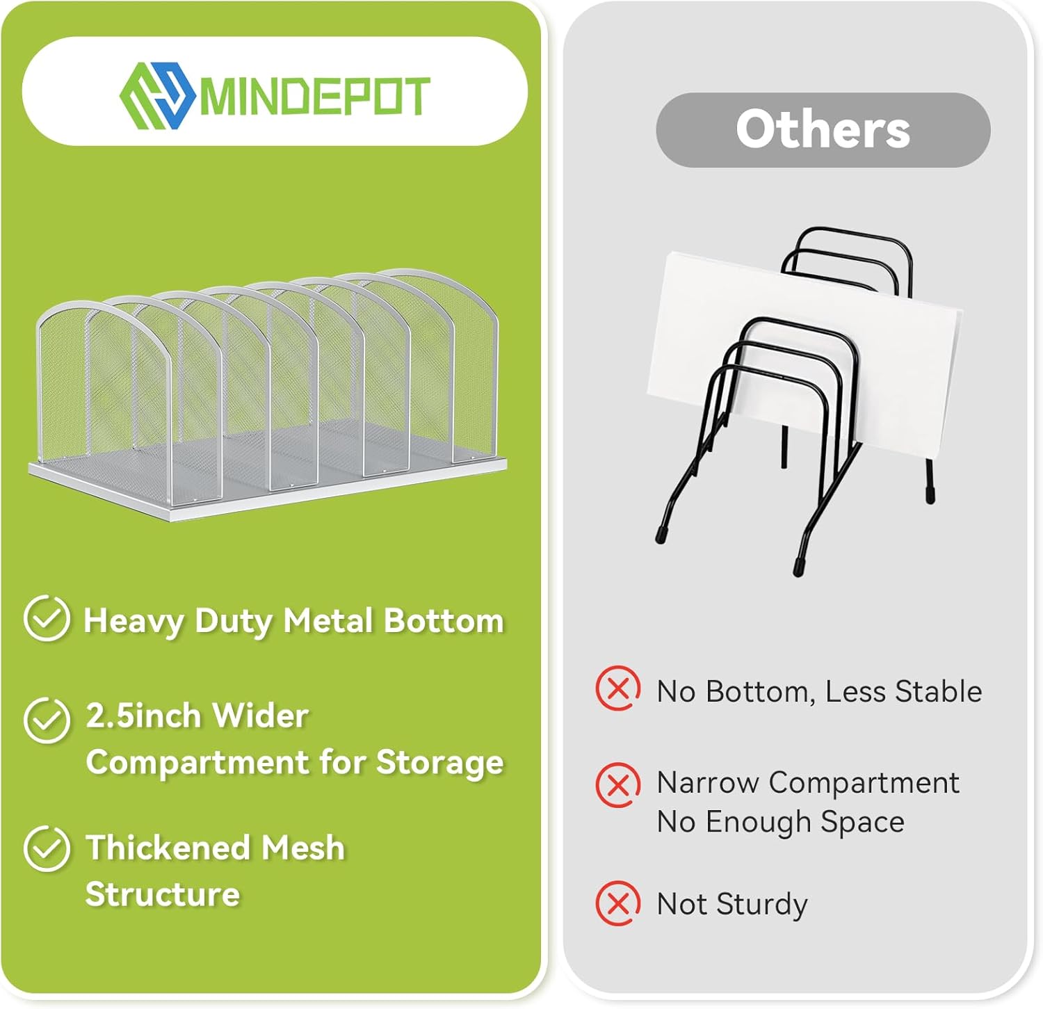 - 7 Section Design with Wide Spacing: This MINDEPOT Desk File Organizer features 7 spacious sections, each with a 2.5-inch gap between, providing ample room for organizing files, books, mails, and more. Compared to other 5-section one, it offers two additional sections and larger spacing for better organization