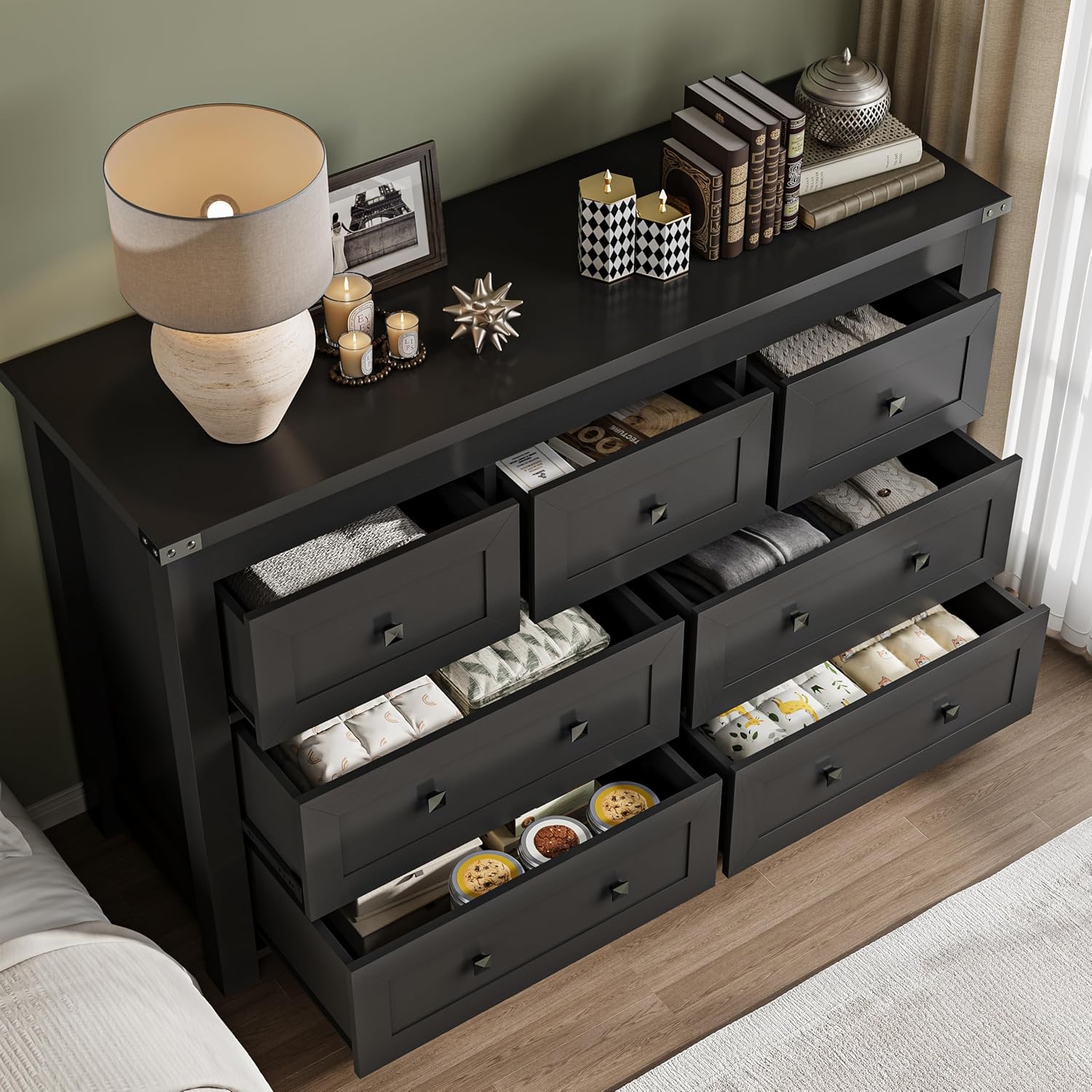- Sturdy & Durable Construction: Made from high-quality engineered wood, BORNOON dresser is built for durability. The scratch-resistant surface maintains its sleek appearance, while the upgraded drawer track system ensures smooth, silent operation. A reinforced base and an anti-tip kit add stability and safety, making it a reliable choice for family homes.
