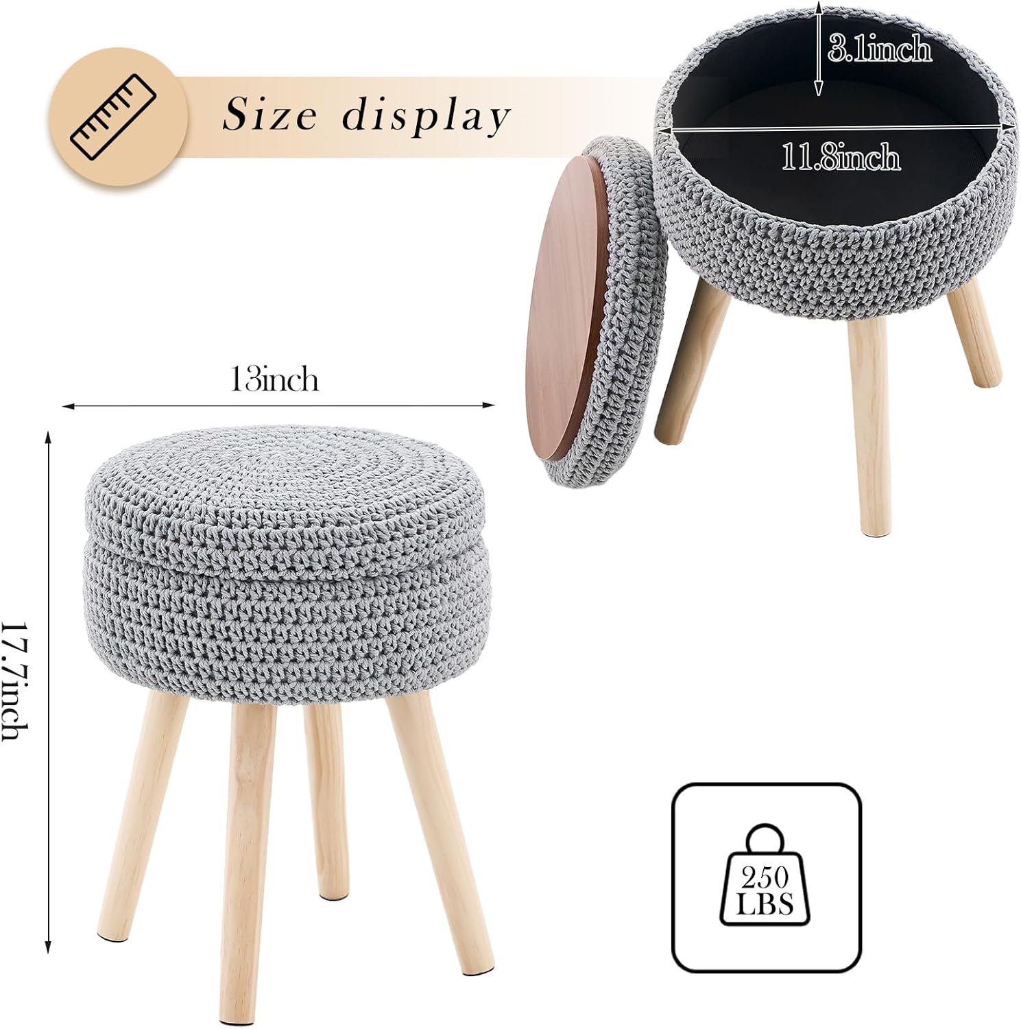 Round Foot Stool Ottoman with Storage Footrest with Wood Legs Cotton Knitted Vanity Stool Tray Top Coffee Table Multifunctional Upholstered Footstool for Living Room Bedroom Grey