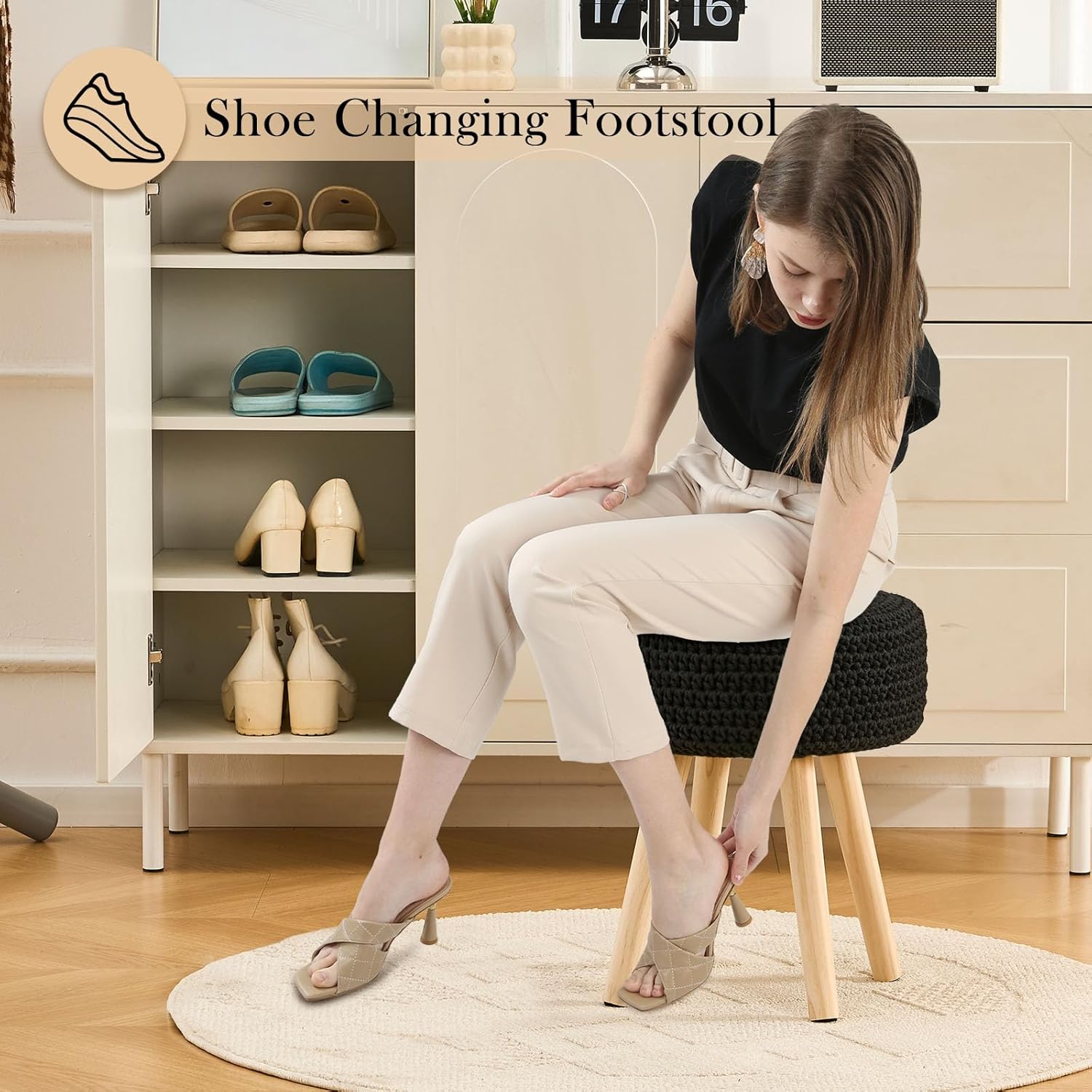 Cotton Knitted Ottoman Round Vanity Stool Modern Footstool Ottoman Footrest with Non-Skid Wood Legs for Living Room Bedroom Black
