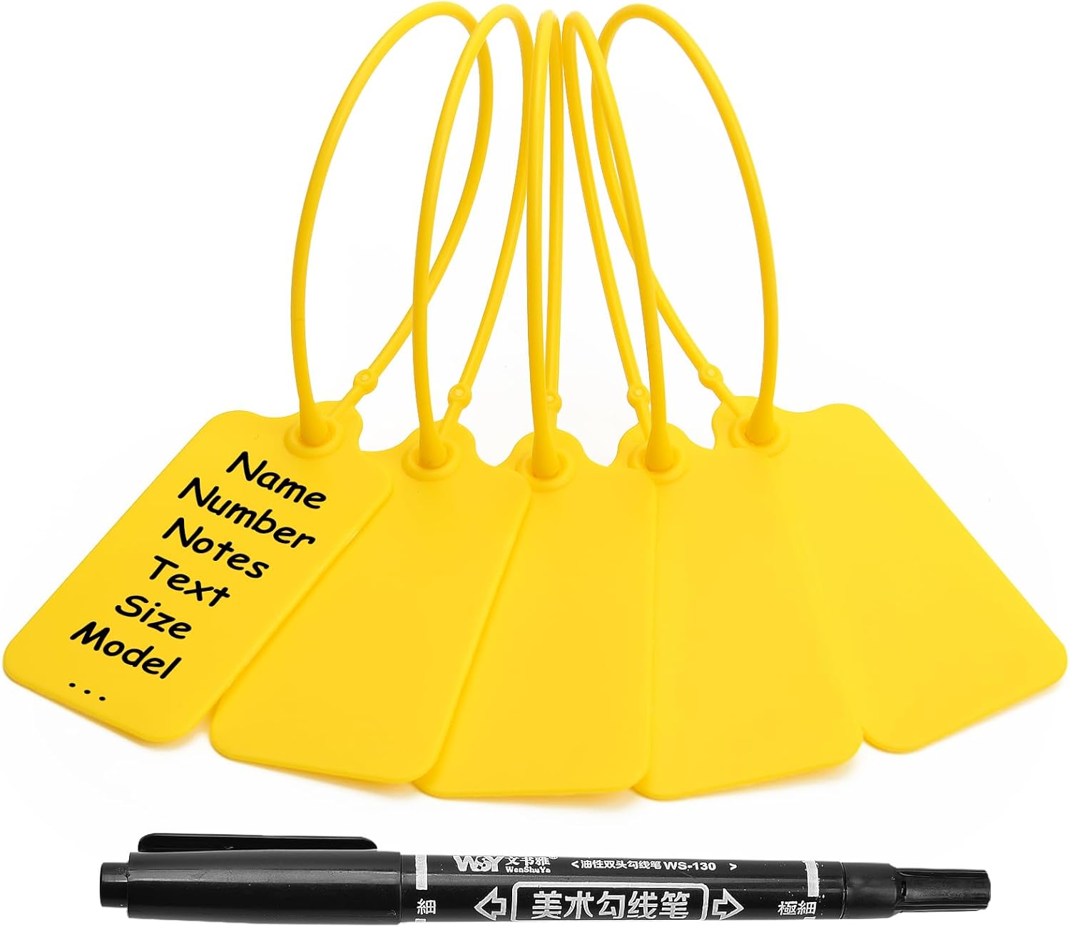 - Writable Tags: The blank platic seal tags can be written on with permanent markers to clearly identify assets. Package include: 100pcs yellow tags and one permanent marking pen.