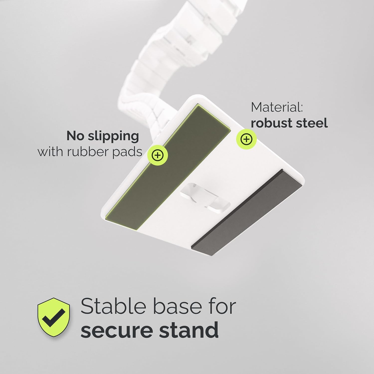 - Sturdy Steel Base for Maximum Stability – The heavy-duty steel base with non-slip pads ensures a secure stand on any surface, preventing cables from tangling or dangling.