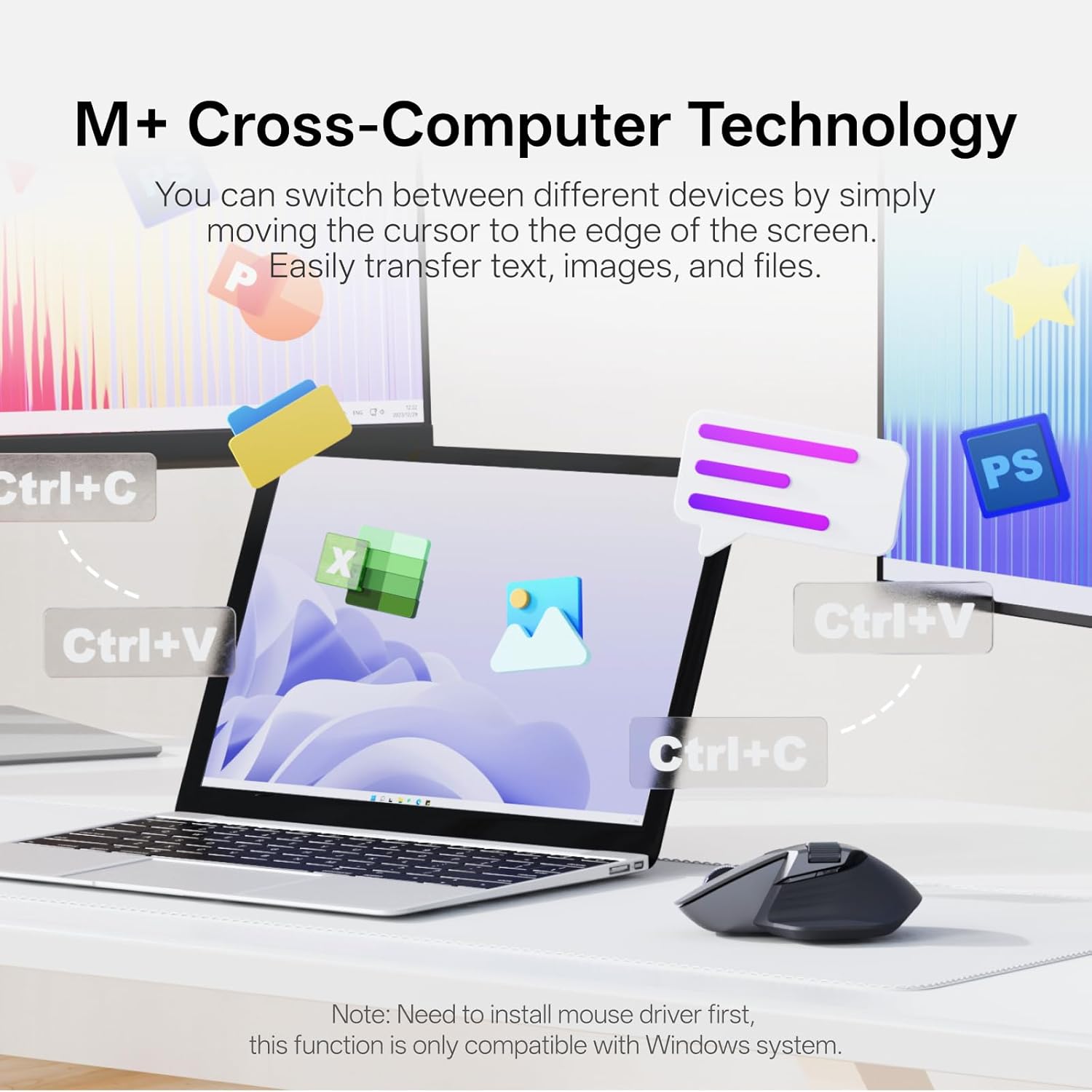 - 【M+ Cross-Computer】Seamless flow between screens by simply moving the cursor to the edge, wireless transferring files by copying from one computer and pasting on the other.