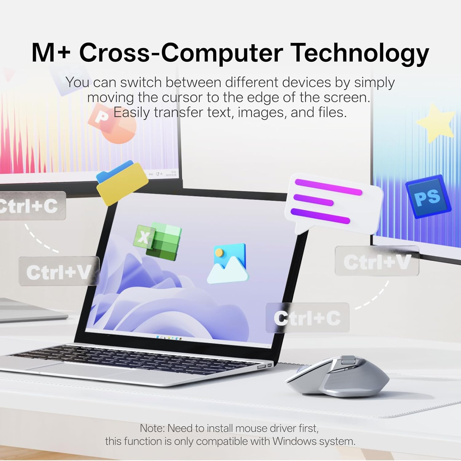 - 【M+ Cross-Computer】Seamless flow between screens by simply moving the cursor to the edge, wireless transferring files by copying from one computer and pasting on the other.