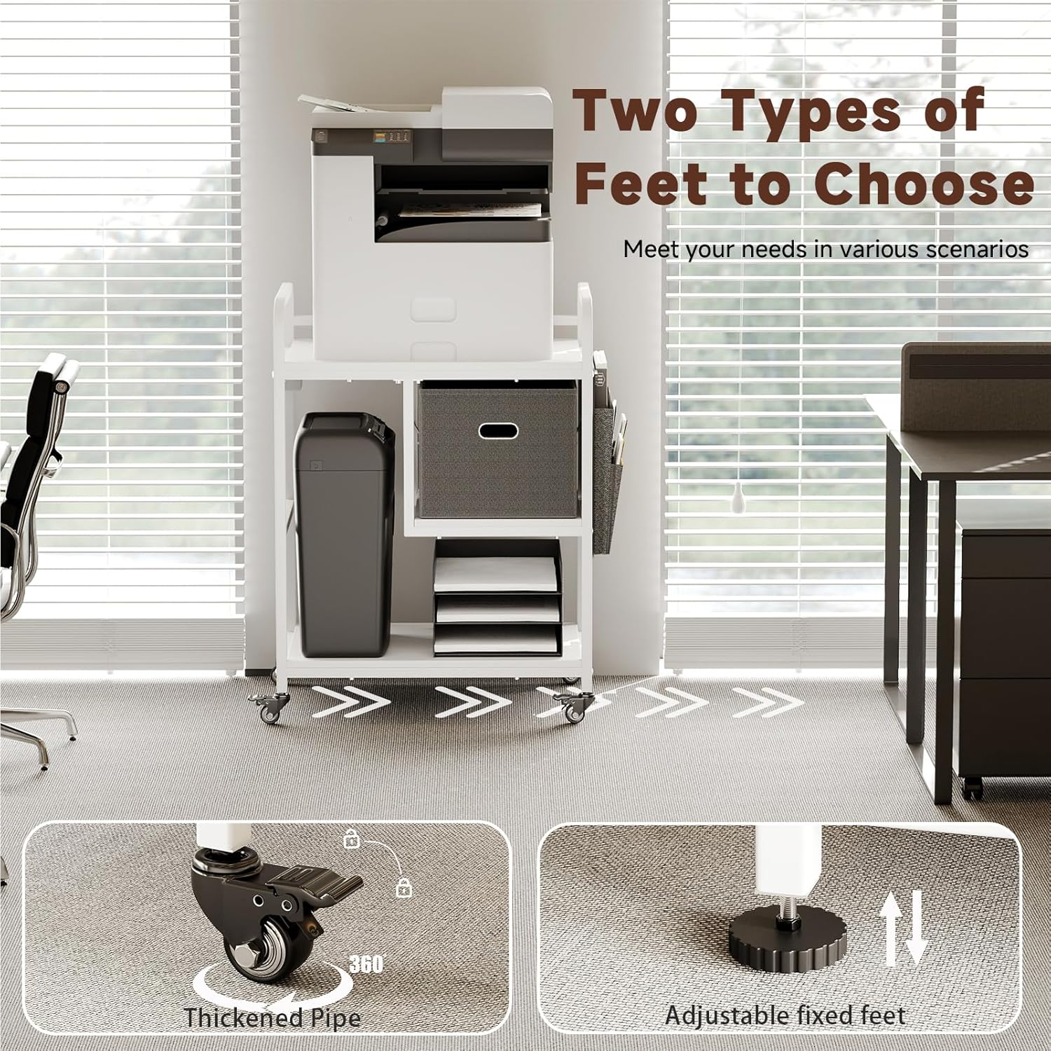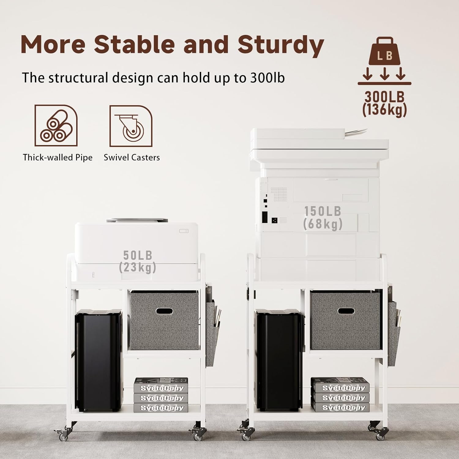 - MULTI-PURPOSE USE: This printer shelf fits most printers, scanners, fax machines, PC towers, shredders or 3D printers. Beyond the office, use it as a microwave or coffee station in the kitchen, a nightstand, side table, balcony shelf, or craft organizer. Perfect for offices, bedrooms, living rooms, and more.