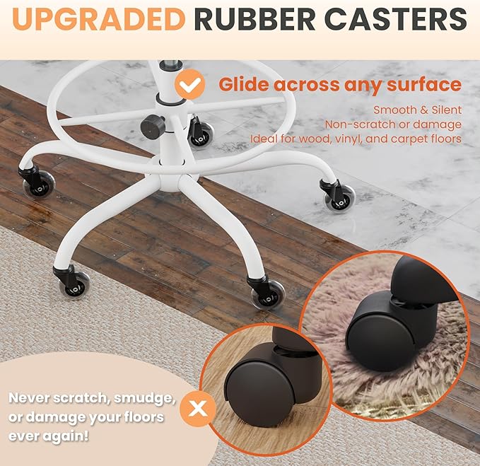 - COMFORTABLE TALL OFFICE CHAIR: This high drafting chair has soft and thick seat to add comfort for your seating; smoothly adjustable height & footrest to adapt your different using senses; and upgraded rubber wheels to avoid noise and scratching of your floor. We made upgrade designs and insist on high quality materials to offer users better experiences.